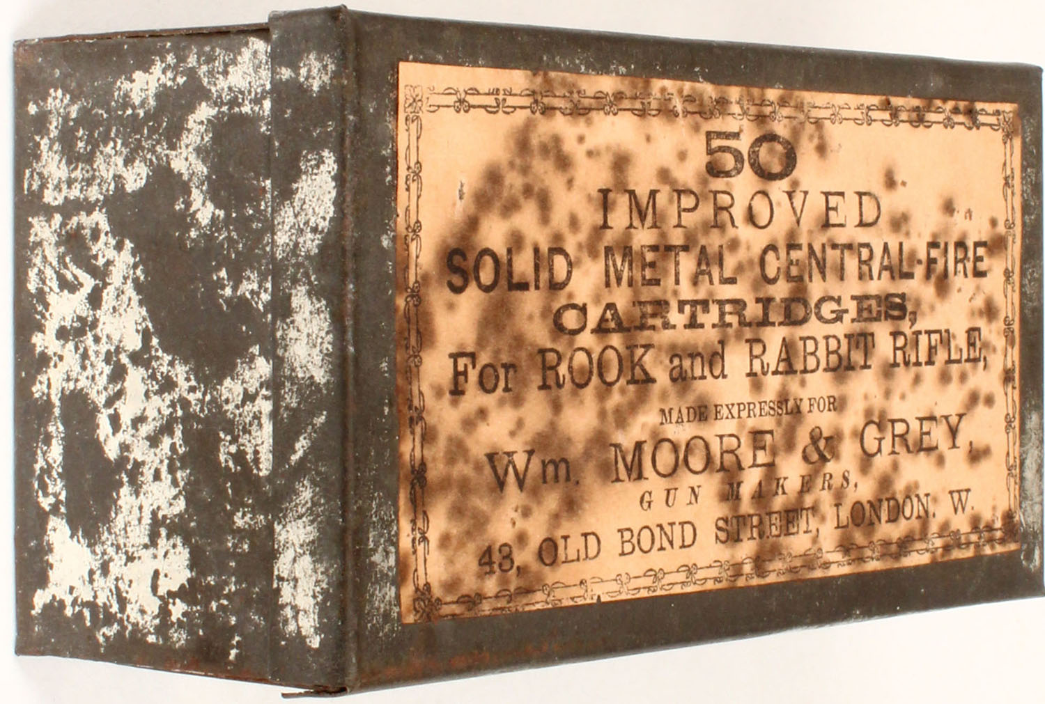 Eley Bros, Solid Metal CF For Rook and Rabbit Rifle, made for Wm. Moore & Grey, FULL, cart H/s: Eley Bros 360 NO.5'', 2pc tin box, some age soiling to label, box is solid. Grade: Very Good + - Value: 50 to 250