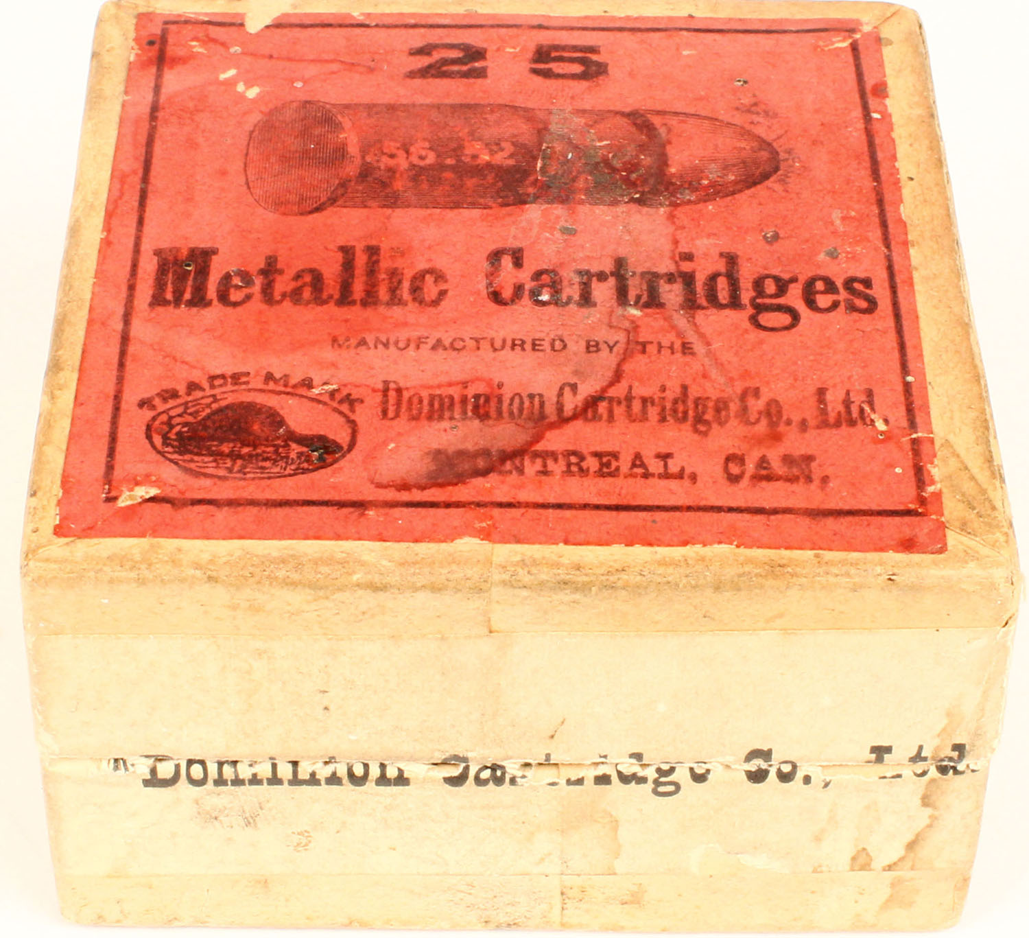 Dominion, Metallic Cartridges, .52 RF, FULL, 2pc. Buff box with red top & tan side sealing labels, box is solid, labels have age soiling, HAS PAPER INSERT. Grade: Very Good ++ - Value: 100 to 300