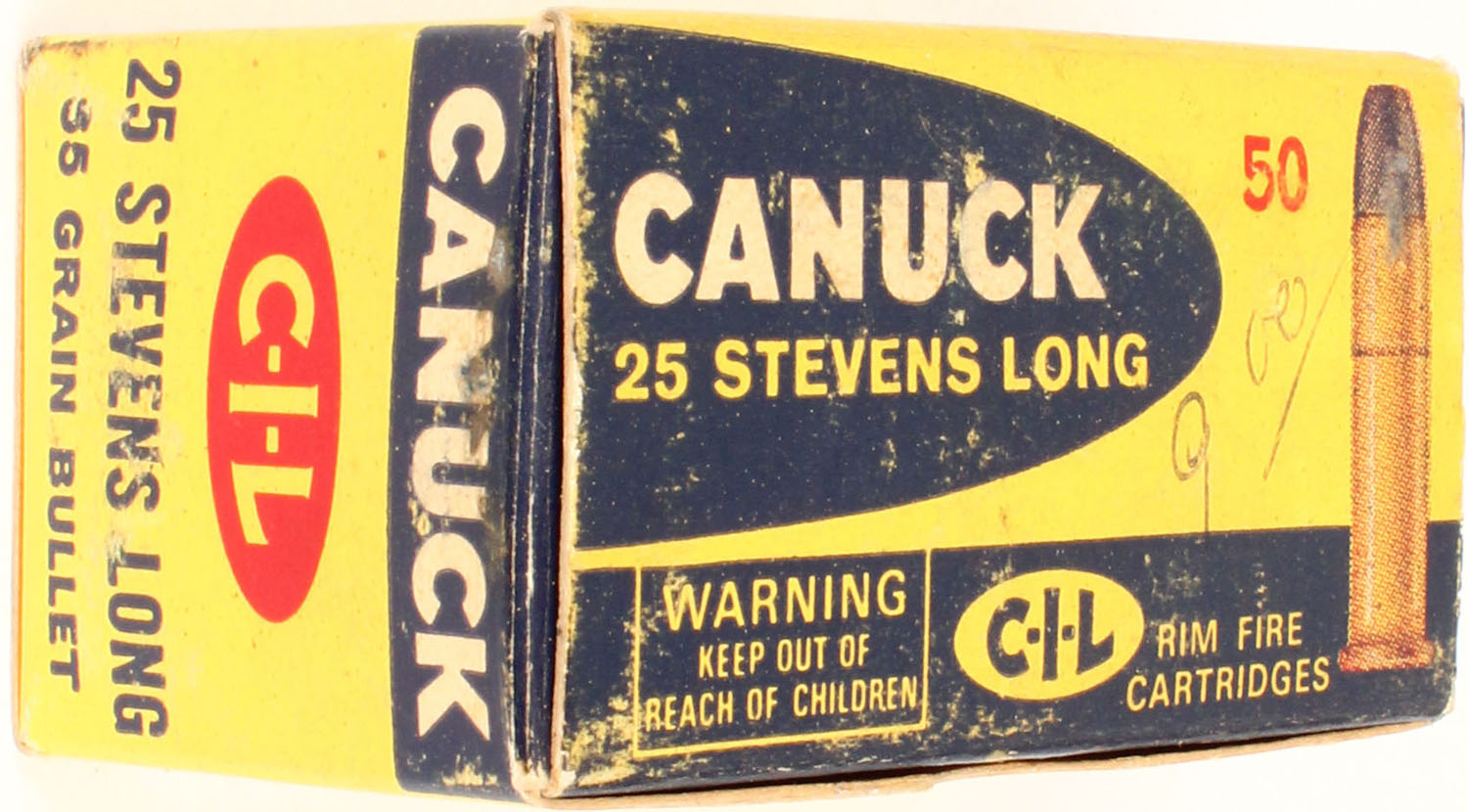 CIL, Canuck, 25 Stevens Long, 65 Grain, Full, 1pc. Multi-colored box, box has scuffing, Ammo is very good. Grade: Very Good + - Value: 50 to 100