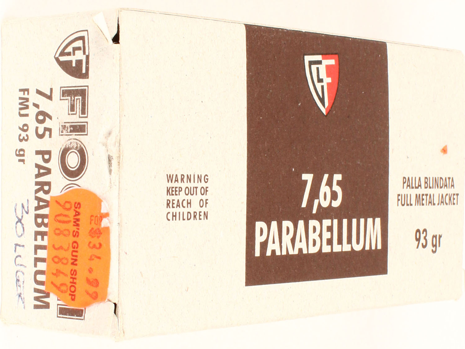 Fiocchi, 7.65 Parabellum, 93 Grain FMJ, Full, 1pc. Multi-colored box, box is solid, has excellent color, Ammo is excellent. Grade: Excellent ++ - Value: 16 to 50