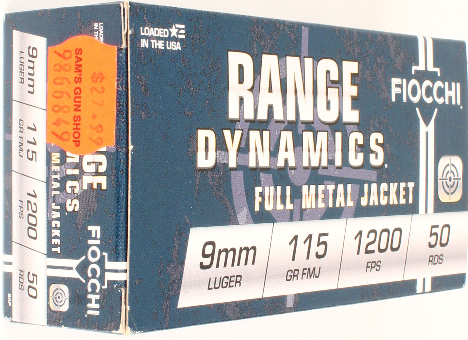 Fiocchi, 9mm Luger, 115 Grain FMJ, Full, 1pc. Multi-colored box, box has scuffing, has excellent color, Ammo is excellent. Grade: Excellent - Value: 16 to 50