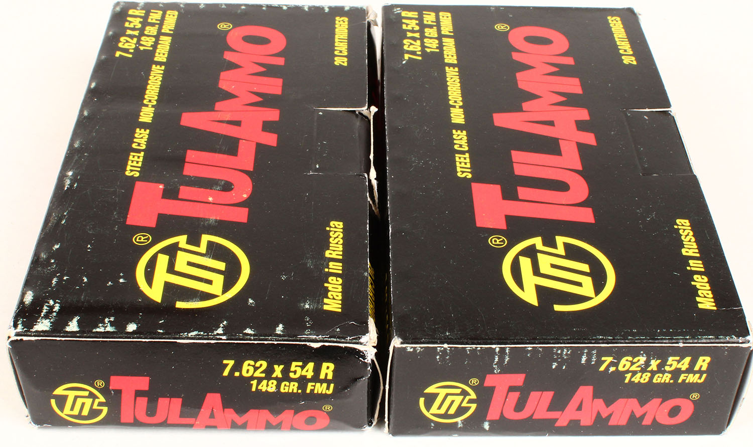 Lot of 2 TulAmmo, 7.62x54R, 148 Grain FMJ, Full, 1pc. Multi-colored box, box is solid, with excellent color, Ammo is excellent. Grade: Excellent - Value: 20 to 60