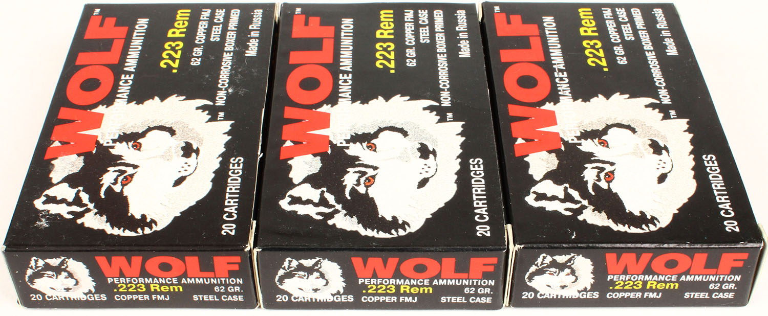 Lot of 3 Wolf, 223 Rem, 62 Grain Copper FMJ, Full, 1pc. Multi-colored box, box is solid, with excellent color, Ammo is excellent. Grade: Excellent - Value: 20 to 60