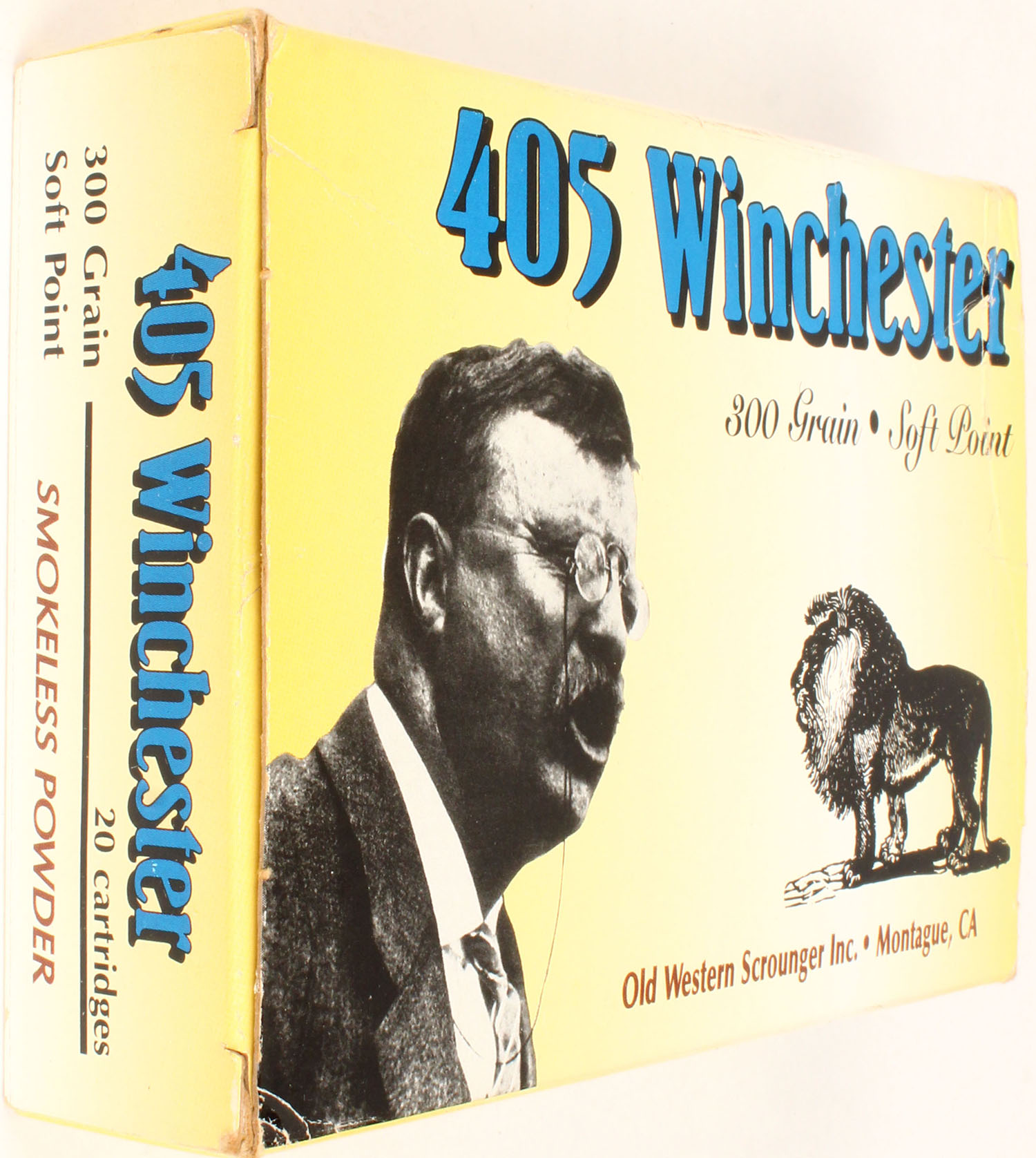 Old Western Scrounger, 405 Winchester, 300 Grs. SP, Full, 1pc. Multi-colored box, box is solid, with excellent color, Ammo is excellent. Grade: Excellent - Value: 20 to 60