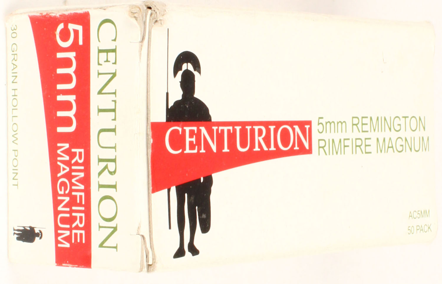 Centurion, 5mm RIM FIRE MAGNUM, Full, 1pc., Multi-colored box, box is solid with great color, ammo is excellent. Grade: Excellent ++ - Value: 20 to 80