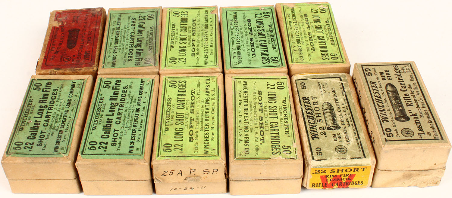 Lot of 11 .22 cal. boxes, 2pc, Empty, multi-colored boxes. Grade: Very Good ++ - Value: 2 to 40