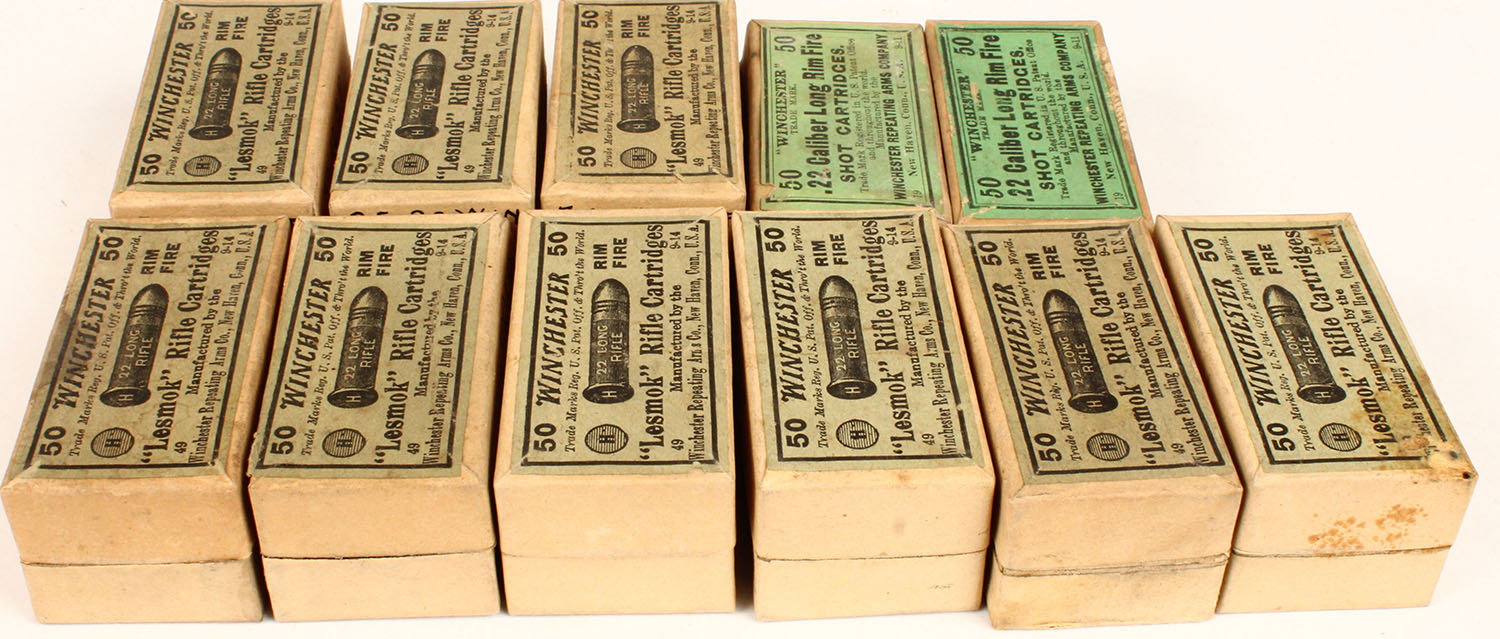 Lot of 11 .22 cal. boxes, 2pc, Empty, multi-colored boxes. Grade: Very Good ++ - Value: 2 to 40