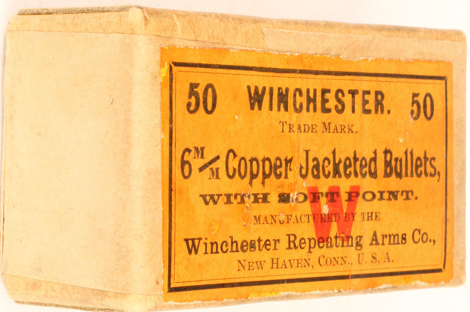 Winchester, 6mm, Copper Jacketed Soft Point Bullets, Partial 49rds., 2pc. Buff box with orange label, box is very solid with great colors, Bullets are excellent. Grade: Excellent - Value: 20 to 60