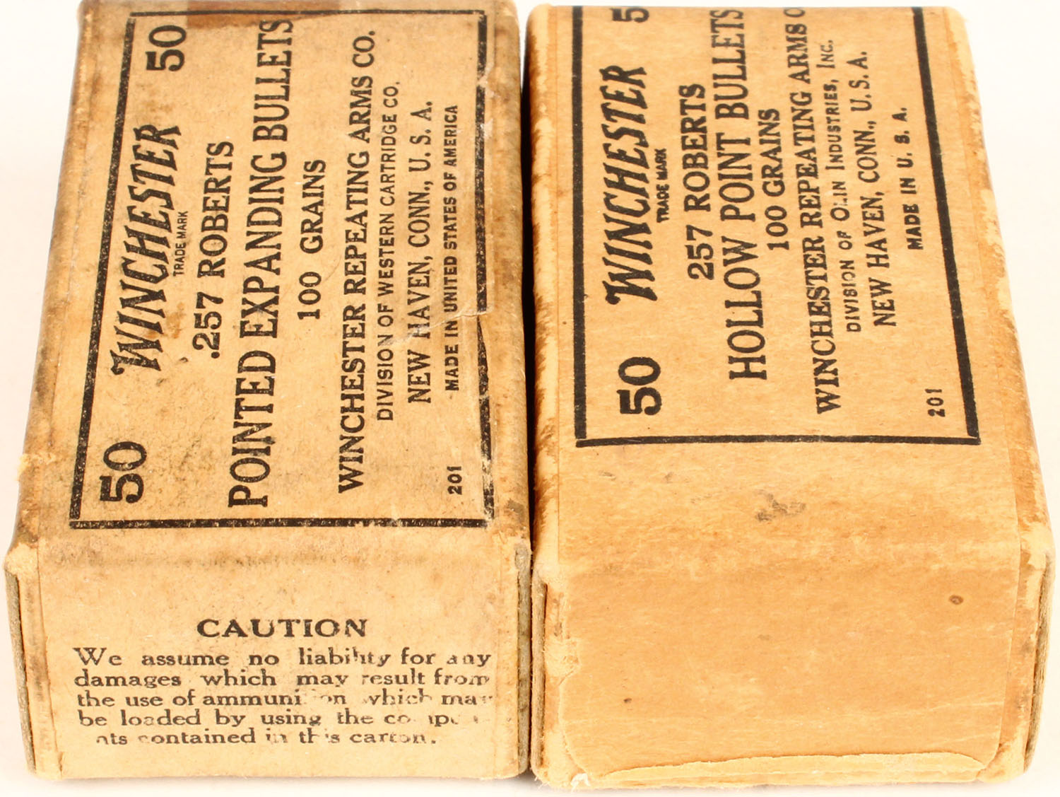 Lot of 2 Western, 257 Roberts, 100 Grs., Full, 2pc. Buff box with buff label, box is very solid, has light soiling & light scuffing with very nice colors, Bullets are very good. Grade: Excellent - Value: 20 to 60