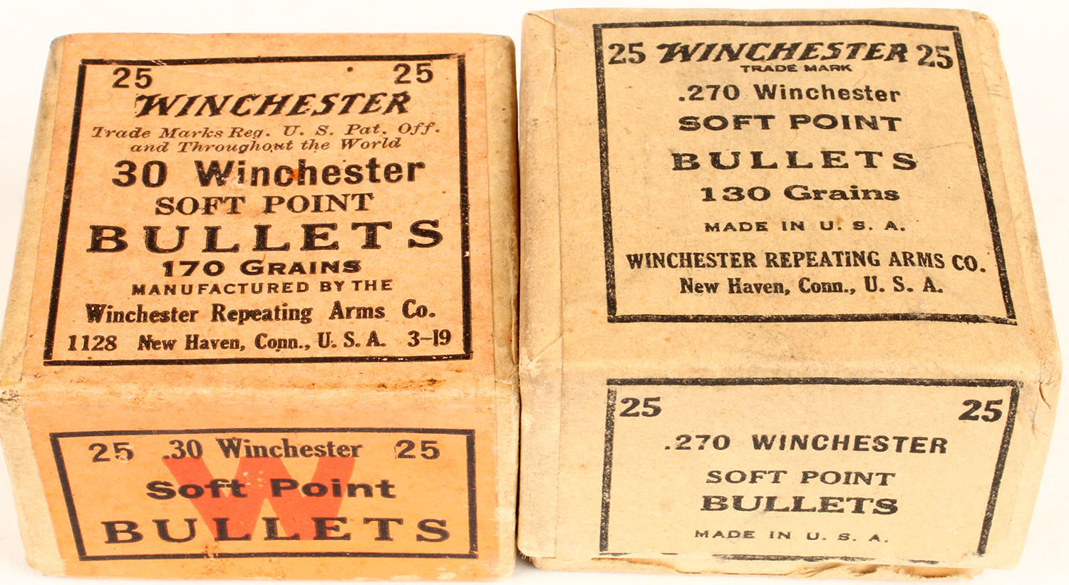 Lot of 2 Winchester Bullet boxes, .30 Win & 270, 2pc., Full. Grade: Excellent - Value: 10 to 60