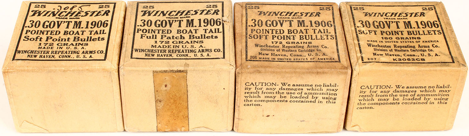 Lot of 4 Winchester Bullet boxes, .30 Gov't, 2pc., Full. Grade: Excellent - Value: 20 to 60