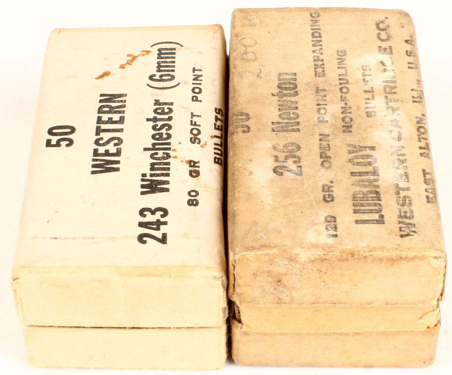 Lot of 2 Western/Winchester Bullet boxes, .256 Newton, 243 Win (6mm), 2pc, Full. Grade: Excellent - Value: 10 to 50