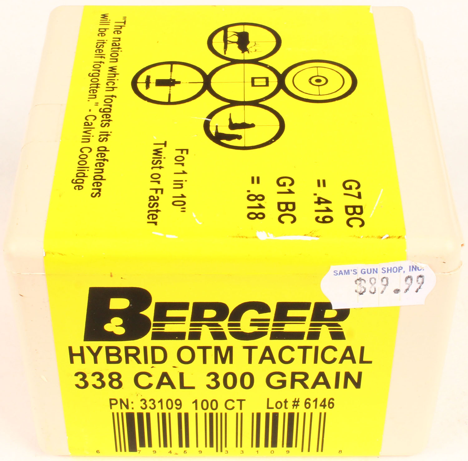 Berger, Hybrid OTM Tactical, .338 Cal. 300 GR., FULL & SEALED 1pc. Tan plastic box, box is MINT with minty color. Grade: MINT - Value: 20 to 100
