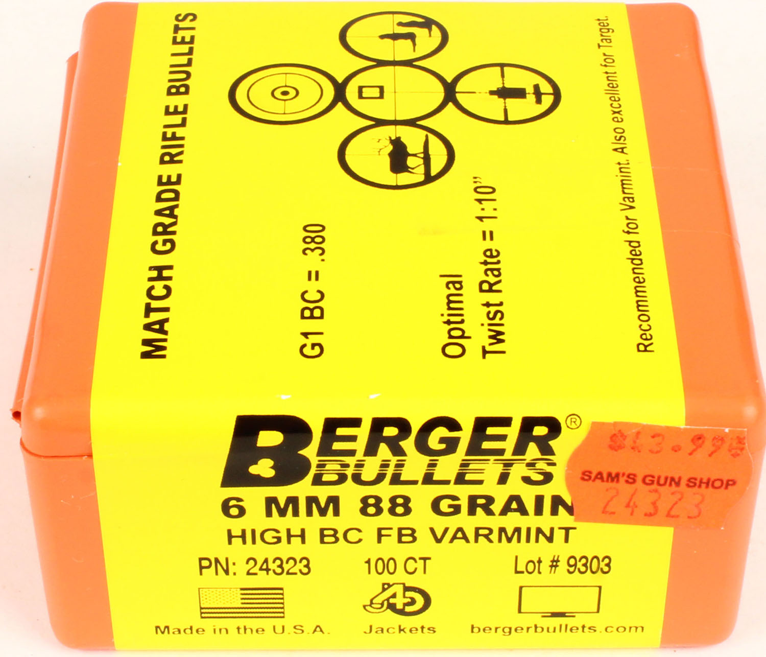 Berger, Match Grade Rifle Bullets, 6mm, 88 GR. High BC FB Varmint, FULL & SEALED, 1pc. Orange plastic box, box and label are MINT with minty color. Grade: MINT - Value: 10 to 50