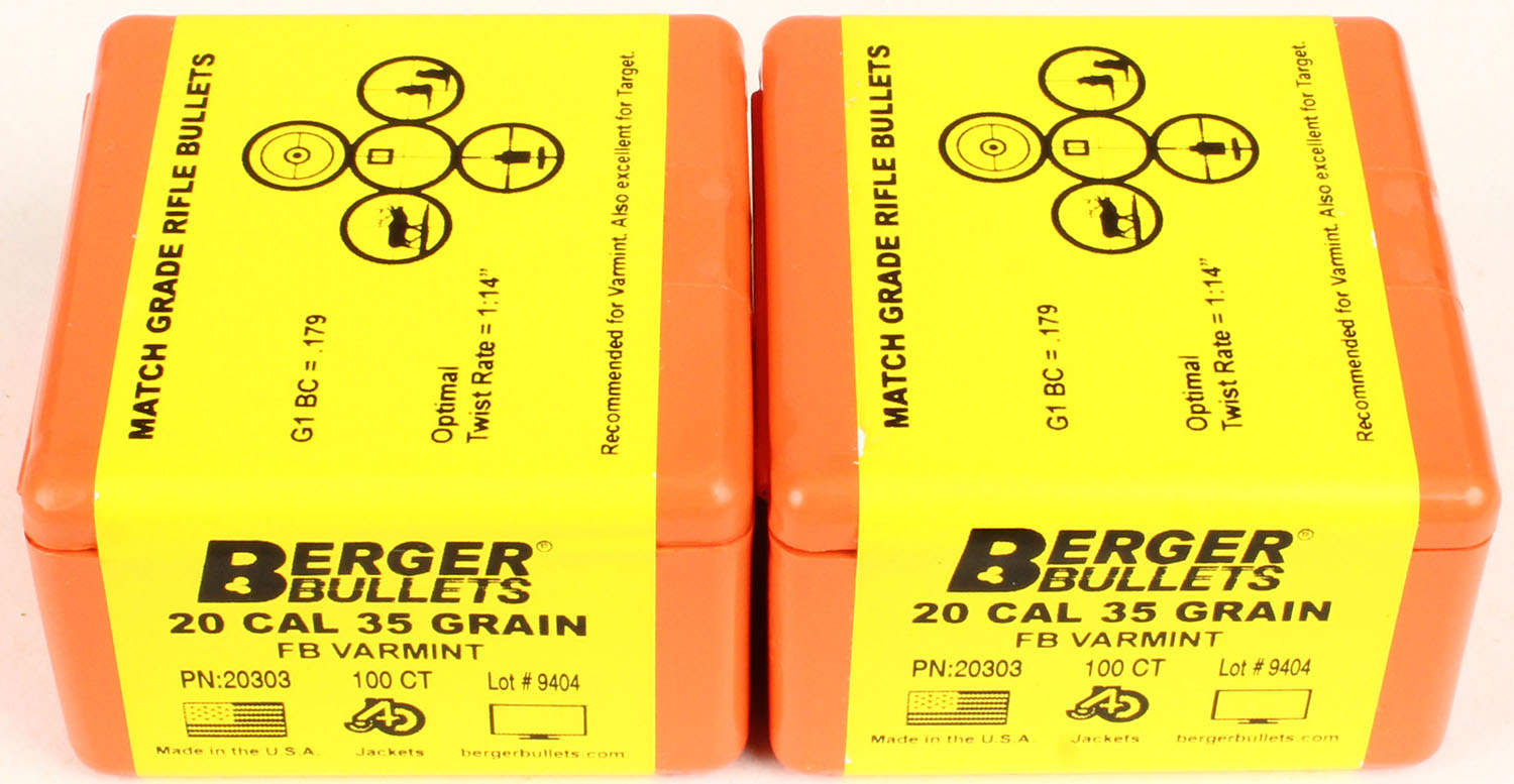 Berger, Match Grade Rifle Bullets, .20 Cal. 35 GR. FB Varmint, Lot of (2) FULL & SEALED, orange plastic boxes, boxes are MINT with minty color. Grade: MINT - Value: 20 to 100