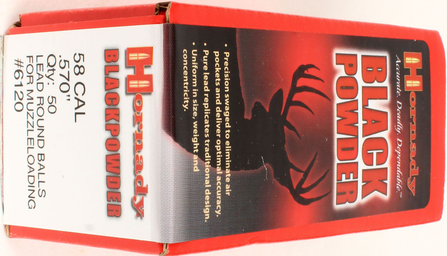 Hornady, Black Powder, .58 Cal. (.570'') Lead Round Balls, FULL & SEALED, 1pc. Red box, box is MINT with minty color. Grade: MINT - Value: 10 to 50