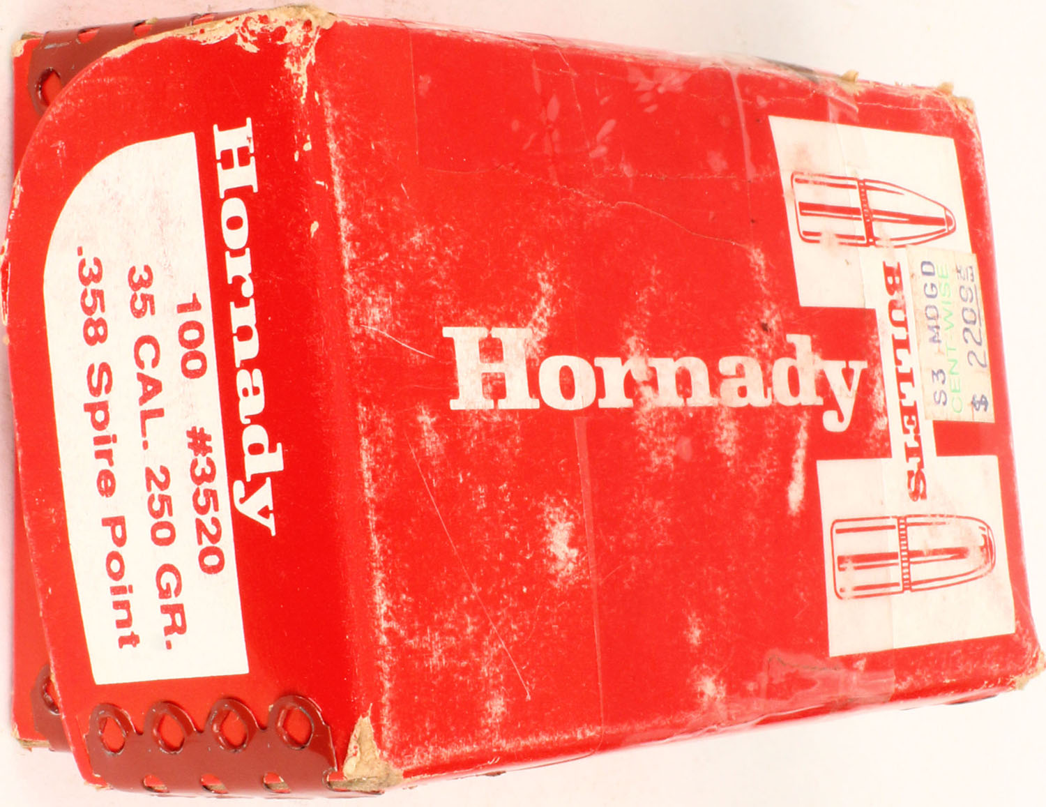 Hornady, .35 Cal. (.358''), 250 GR. Spire Point, Full, 1pc. Red & white box, box is solid with excellent color, some shelf & corner wear, bullets are minty. Grade: Excellent - Value: 10 to 50