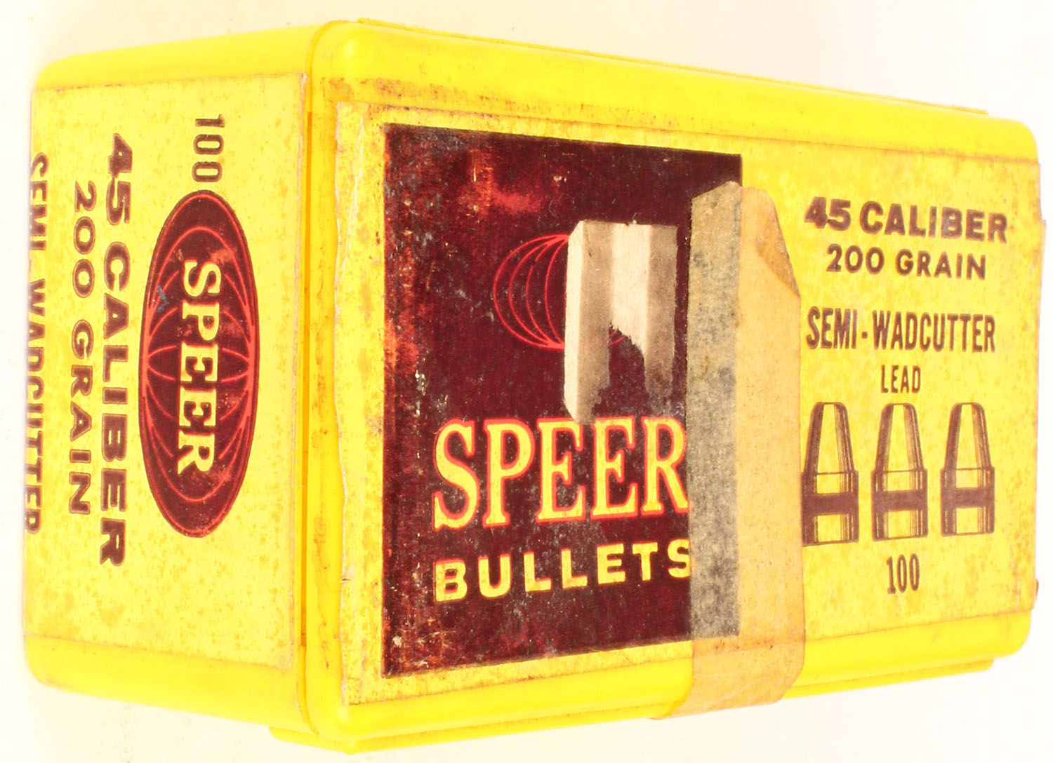 Speer, . 45 Cal., 200 GR. Semi- Wadcutter, Full, 1pc. Yellow plastic box, box is solid with very good color, age soiling, tape, bullets are minty. Grade: Excellent - Value: 10 to 50