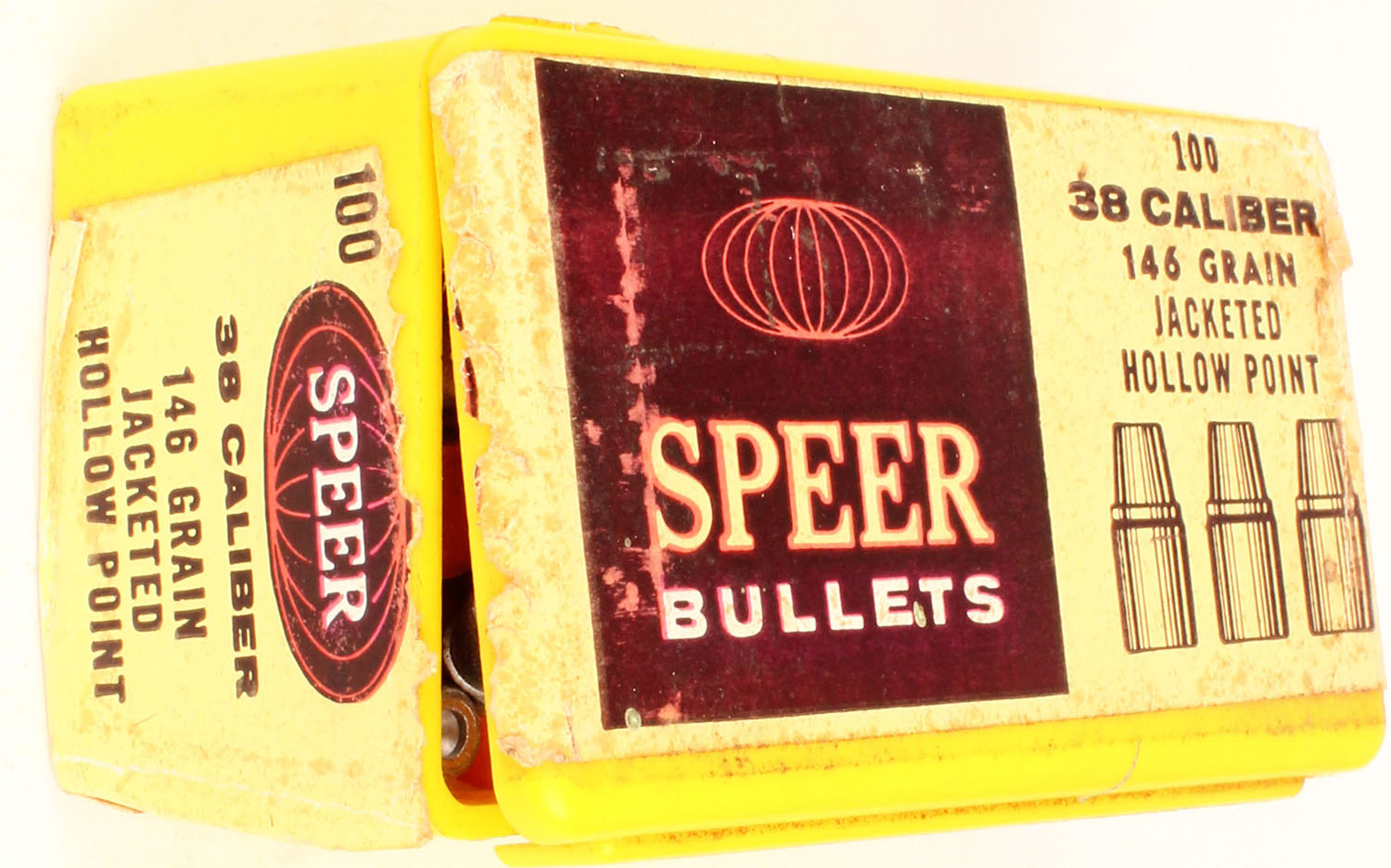 Speer, .38 Caliber, 146 Grain Jacketed Hollow Point, Full, 1pc. Yellow plastic box, box is solid with very good color, age soiling, shelf wear, bullets are minty. Grade: Excellent - Value: 10 to 50