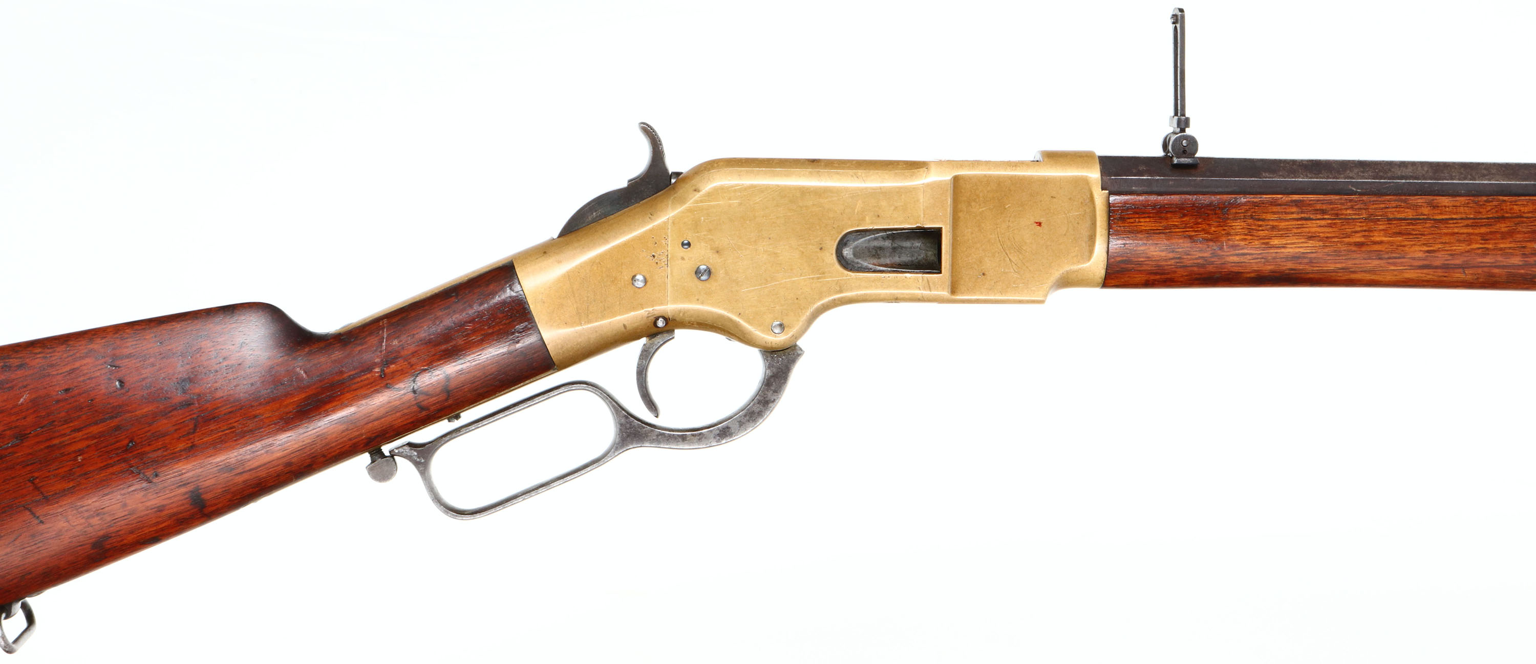 Winchester, Model 1866, Third Variation, .44 Henry Cal., MFG. 1870 (Antique), SN: 37234, Lever Action Rifle, 24 1/4'' Octagon barrel, Full mag. The Model 1866 proved an immediate success for Winchester, with around 170,000 guns produced. The M1866 appeared in three forms, carbine, rifle, & musket. The carbine made up 127,000 of the guns produced, making it by far the most popular, another 15,000 were musket, leaving just 28,000 rifles. A fairly small amount of rifles when comparing it to other Winchester models. The original wood stocks on this example are very good & solid, having added oils over the original finish giving it a rich & darkened oil appearance. The forend has nearly a full length tight grain crack on the right side, while both stocks display numerous small nicks, gouges & contusions, especially on the stock. The metal finish on the barrel & mag has fully toned to a full coverage dark chocolate brown patina. The brass receiver, forend cap & buttplate have developed an even aged mustard tone. Bore is good to very good, with some cleaned pitting & roughness amongst solid rifling. Barrel mounted with the correct flip-up ladder rear sight, slide graduation to 900 yds & a small blade front sight. Consistent with the 3rd model, it has the block font SN stamped behind the trigger on lower tang. Rifle has the hinged trapdoor crescent brass buttplate. Fitted with an early factory sling loop in the fore cap & stock. The action is tight when it's cycled. This is a very nice 1866 rifle. Retaining much of its original character. A great antique brass rifle. Antique, No FFL Req. - Value: 6000 to 12000