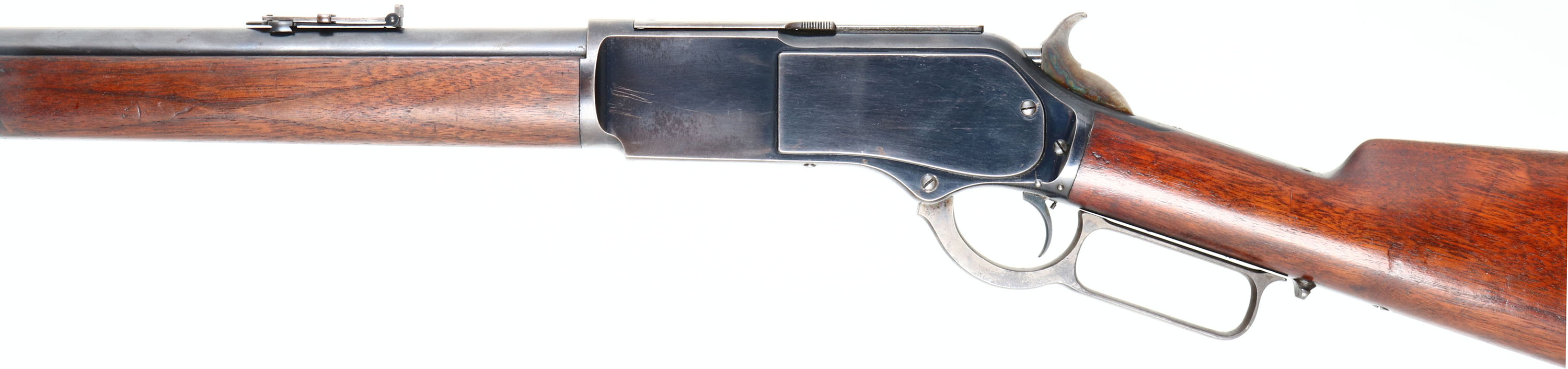 FABULOUS Winchester, Model 1876, Second Variation, 45-60 Cal., MFG: 1882, SN: 22987, Lever Action Rifle, 28'' Round barrel, Full mag. Transition rifle, with 2nd variation dust cover rail & 3rd variation dust cover. The original wood stocks are excellent & solid. Wood finish is original, with some added protective oils or waxes. There are very few tiny handling marks, light scratches & contusions. The factory metal blue on barrel & mag is 95%. The receiver displays a full 90% of the original high luster blue toning in areas of thinning. Original blue remains well above average. The case-hardened lever, hammer & trigger display fading case-colors. Bore is excellent & bright, with a couple of spots of roughness. Set Trigger. Barrel carries the original 1876 marked adjustable ladder rear sight & period front sight. Stock carries a sliding trapdoor crescent metal buttplate. Original dust cover is tight & slides smoothly. Action is tight & smooth. Comes with a Cody Winchester Factory Records look-up sheet, which confirms dates & configuration. A fantastic original example & collector's quality rifle.* Antique, No FFL Req. - Value: 12000 to 15000