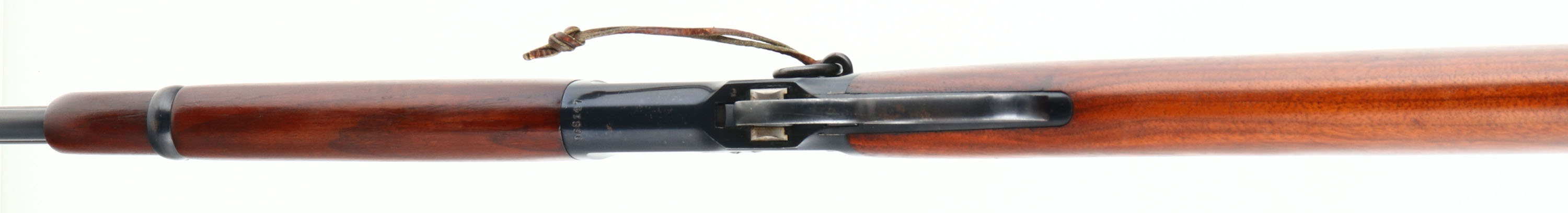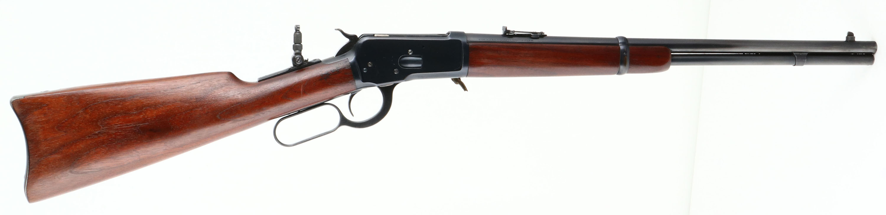 FANTASTIC Winchester, Model 92 SRC, marked 25-20 WCF, MFG. 1926, SN: 968147, Lever Action Rifle, 20'' Round Barrel, Full mag. The original wood stocks are excellent & solid. They carry the original finish, with few light handling blemishes or scuffs. The barrel & mag carry 98% of original factory blue, 97% on receiver. Bore is very good. Fitted with a Lyman flip-up adjustable tang sight, carbine ladder rear sight & carbine box front sight. Metal carbine buttplate. Original saddle ring, with leather strap. Tight action. A fabulous little carbine in original condition & very collectible.* FFL or C&R Req. - Value: 5000 to 7000