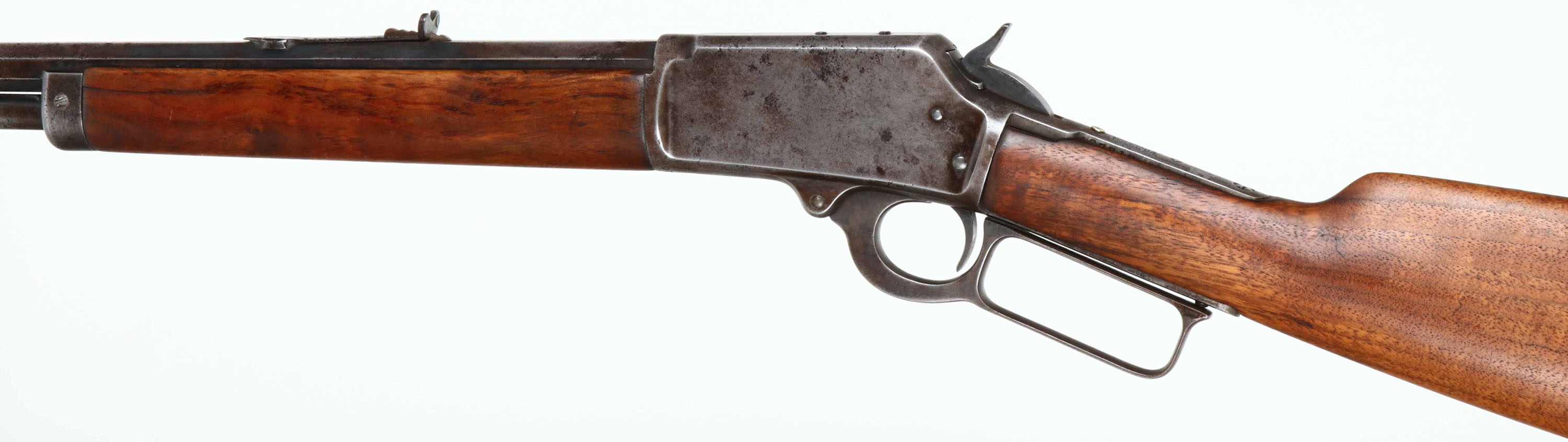 Marlin, Model 1894, Marked .25-20 Cal., MFG. 1910-20, SN: 427710, Lever Action Carbine, 20 1/2'' Octagon, Full mag., The straight grip wood stocks are good & solid, having been heavily sanded & reoiled. The stock have a few minor handling marks remaining. Metal is proud to wood at tangs, receiver & buttplate. The original metal blue finish on barrel & mag has worn to a mix of gun metal gray, remnants of blue & brown patina, with spotty areas of cleaned pitting. The receiver has worn to gun metal gray, with thin spots of brown patina. Some faint remains of the original case-colors on the case-hardened lever. Barrel carries an adjustable rear & blade front sights, with cleaned pitting on the rear sight. One of the tang screw holes has a brass filler pin. Stock carries a crescent metal buttplate. Bore is poor with heavy pitting & scarring amonst faint rifling. Tight action. Popular little caliber for varmint hunting. FFL or C&R Req. - Value: 200 to 400