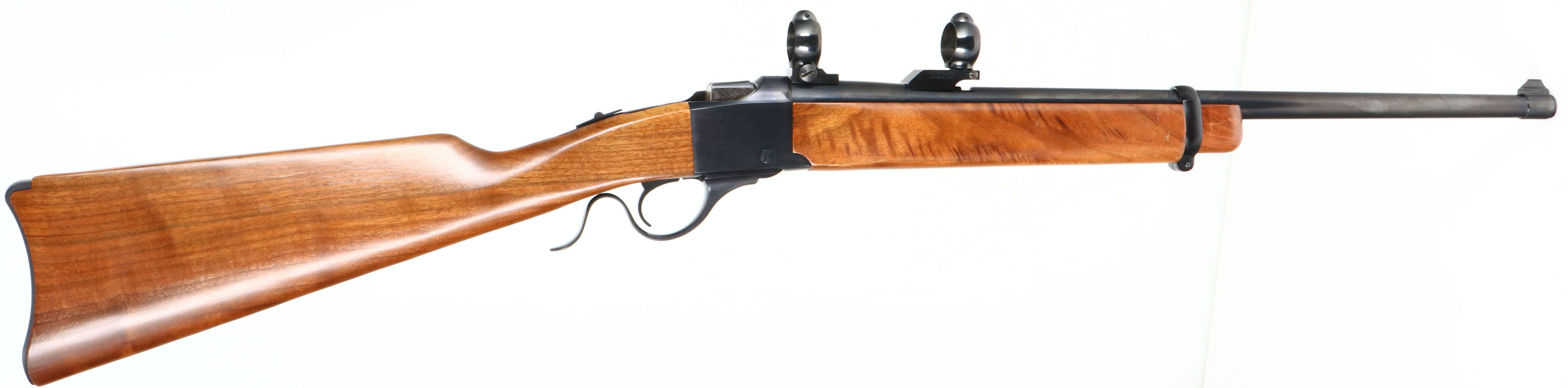 Ruger, Model 3 Carbine, CAL: .22 K Hornet, MFG: 1972-87, SN: 130-67310, Lever Action Falling Block Rifle, 22'' round tapered barrel. Rare .22 K Hornet caliber, barrel stamped both ''22 HORNET'' & above that stamped ''22 K HORNET''. The factory straight grip wood stocks are excellent, with few tiny handling marks to the original finish. The original metal blue finish is 99%+ on the barrel & receiver. Bore is excellent. Barrrel has Buehler scope blocks & ring, an open rear dovetail & factory blade front sight. Original smooth metal buttplate. Near new condition. FFL Req. - Value: 700 to 1200