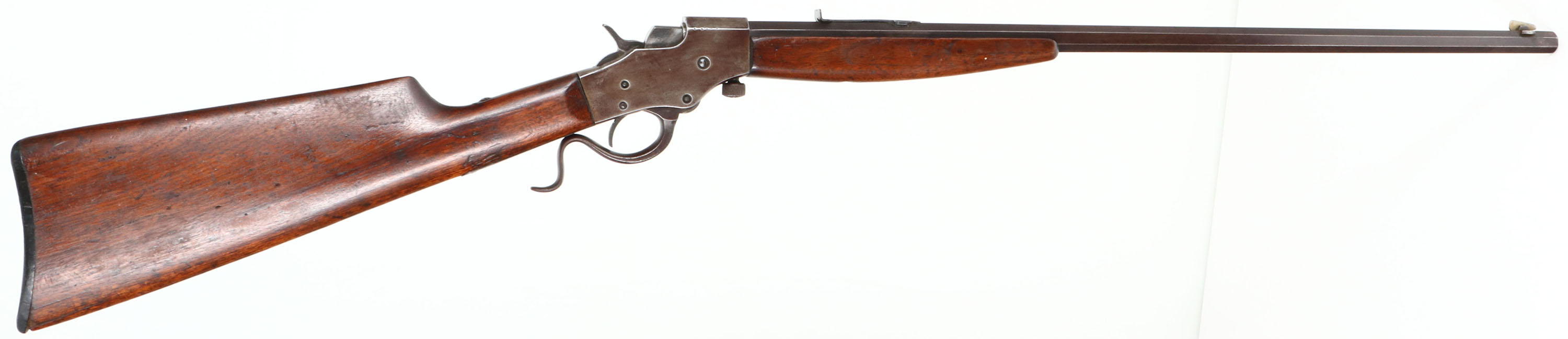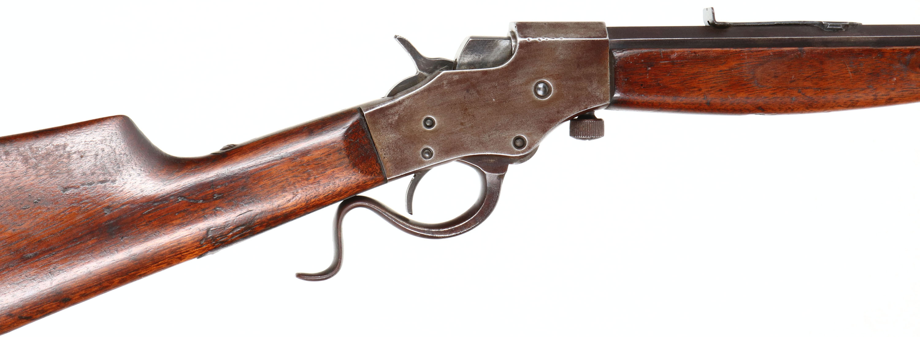J. Stevens Arms, Model 1915, CAL: 25 Stevens, MFG: 1915-35, SN: P20, Lever Action Single Shot Rolling Block Rifle, 24'' barrel. The original straight grip wood stock & forend are very good, having an added coat of finish. The toe has (3) 1 1/2'' grain cracks, as well as multiple contusions, nicks & dings. The metal finish has fully toned to a brown patina, with areas worn to metal grey & some added brown finish. Bore is good, with roughness & intermittent pitting. The barrel holds an adjustable rear sight (missing elevator) & a blade front sight. The stock has a worn Stevens Favorite checkered buttplate. FFL or C&R Req. - Value: 100 to 200