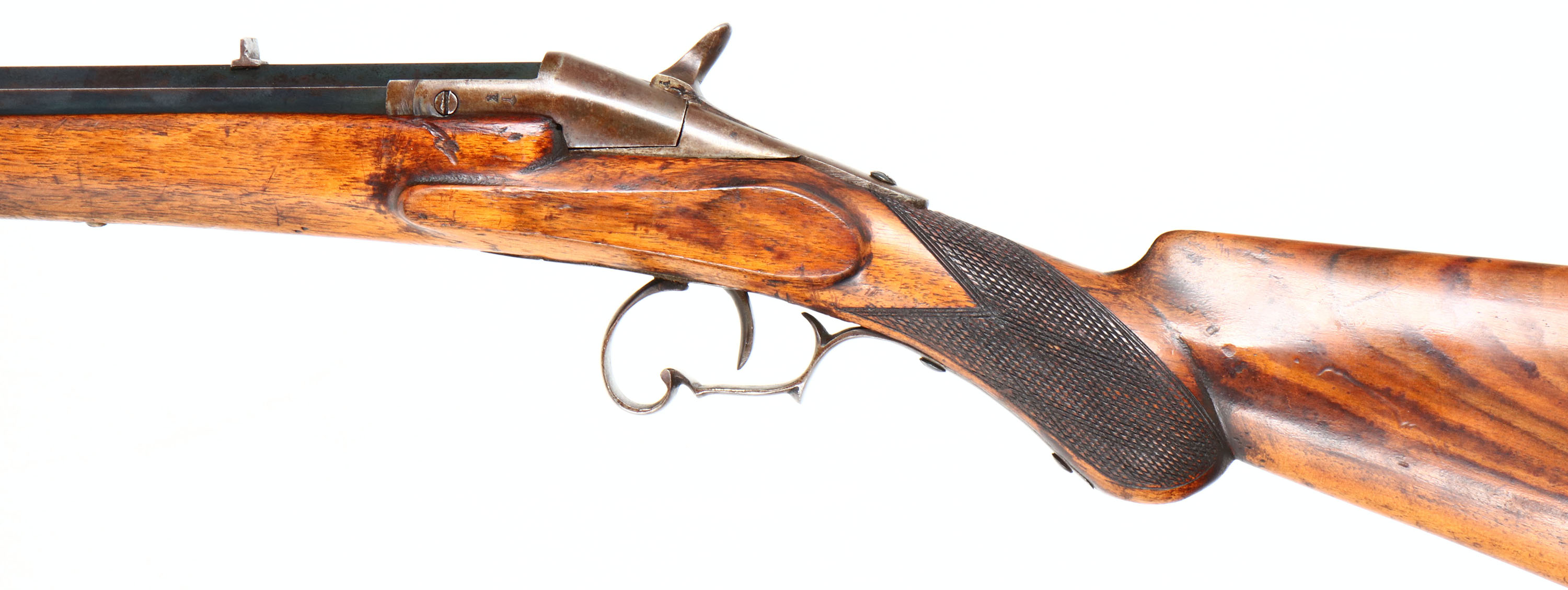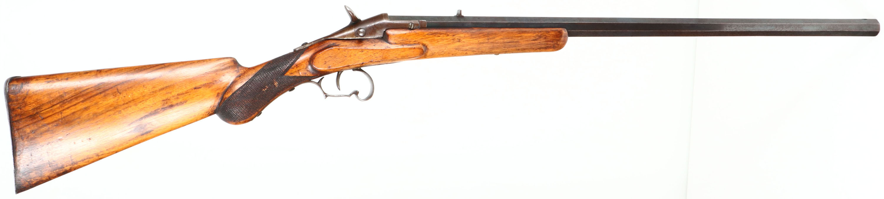 Belgian Single Shot Rifle, CAL: micrometer @ .45 (marked FL.22.L), MFG: N/A, SN: 105, Breech Load Flip-Up Action, 23 7/8'' barrel. The original checkered round knob wood stock is very good & solid, having been sanded & refinished. There are contusions, scrapes, dings & darkening to areas from added oils/finish. The metal blue finish has toned to a mix of remaining 80% blue & brown patina, with rust speckling. Bore is fair & clean. The barrel holds a fixed notch rear sight & an open front dovetail. Stock has a smooth metal buttplate. We believe the rifle was rechambered & converted to center-fire. The firing pin is missing. Antique, No FFL Req. - Value: 150 to 250