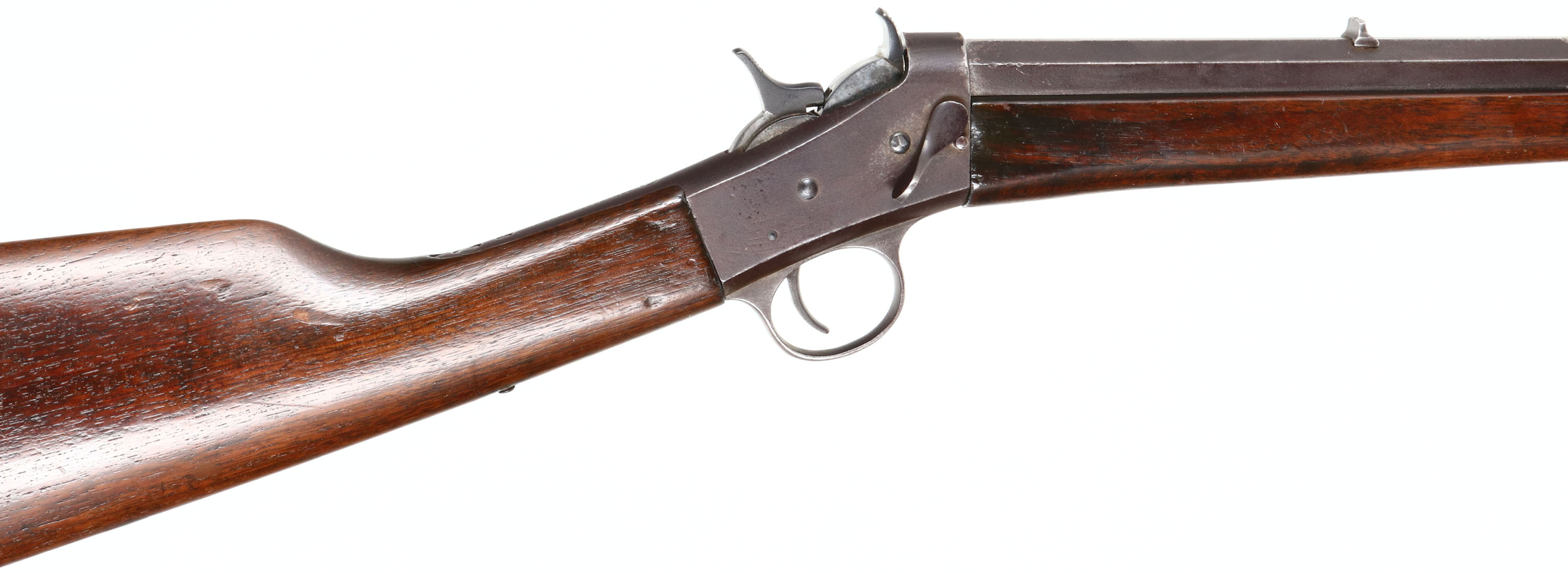 Remington, Model 4 Rolling Block Take-Down, CAL: marked 32 (believed to be 32 Rim Fire), MFG: 1901-26, SN: 148347, Single Action Rolling Block, 24'' Tapered octagon barrel. The straight grip wood stock is very good & solid, having been cleaned & given an added coat of finish. There is a dowel fill on the belly of the stock, ahead of a small brass tack. Stocks have small contusions, scrapes & dings. The metal blue finish has fully toned to a brown patina, with several nick around the barrel address. Bore is good, with cleaned pitting & roughness amongst strong rifling. The barrel holds a fixed notch rear sight & blade front sight. Stock has a smooth metal buttplate. FFL or C&R Req. - Value: 200 to 400