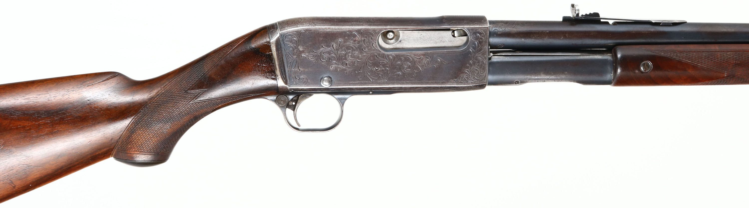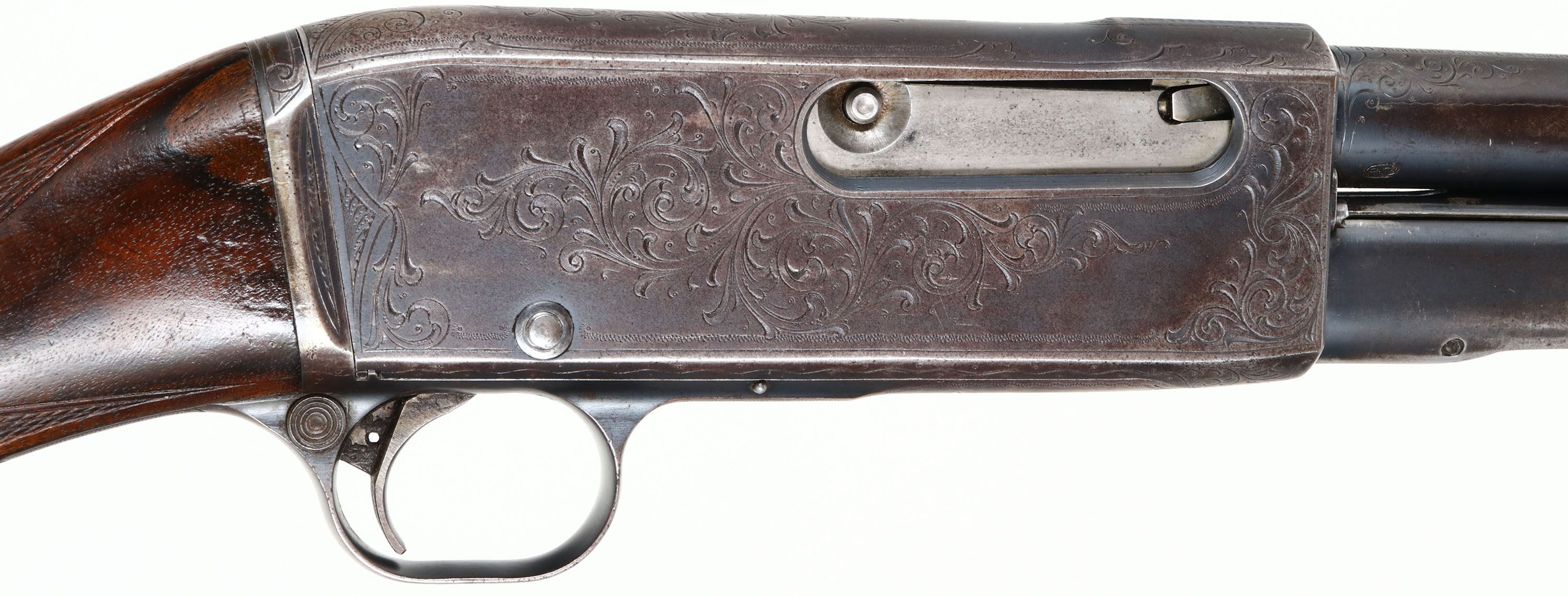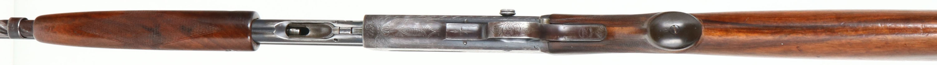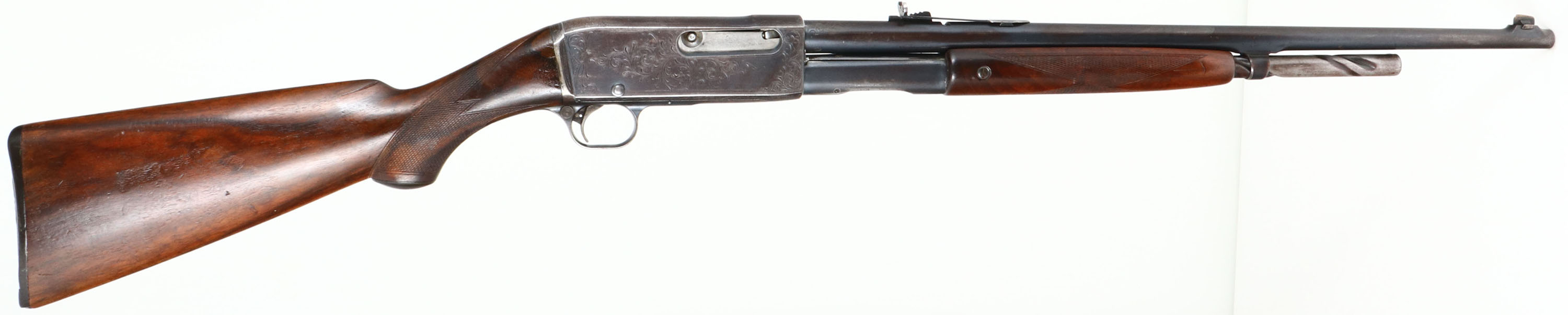 RARE ENGRAVED Remington Model 14 ''PEERLESS'' GRADE, marked 30 REM, MFG: 1913, SN:14130 , Pump Action Rifle, 22'' round barrel. This is a Remington factory custom shop Deluxe Peerless Grade 4, later known as the ''D'' grade. The receiver side panels are covered with what Remington marketed as ''rich scroll hand engraving''. Engraving is also found on the barrel & trigger guard. The original deluxe hand checkered & capped pistol grip English walnut stocks are excellent. The checkering is 20 lines-per-inch. The stocks have some minor contusions & scratches & one larger bruise to the right side of the stock. The original metal blue finish is thinning in areas & toning to a brown patina where thinning, retained at 80% on barrel, 70% on receiver & 40% on the magazine tube. Bore is very good. Stock carries the original Remington hard rubber buttplate, with a couple of small edge chips. Barrel carries an adjustable rear & brass blade front sights. Stamped brass cartridge head inlaid on the left side of the receiver. Smooth tight action. A very good example of this rare Special Order & very collectible rifle.* FFL or C&R Req. - Value: 3000 to 6000