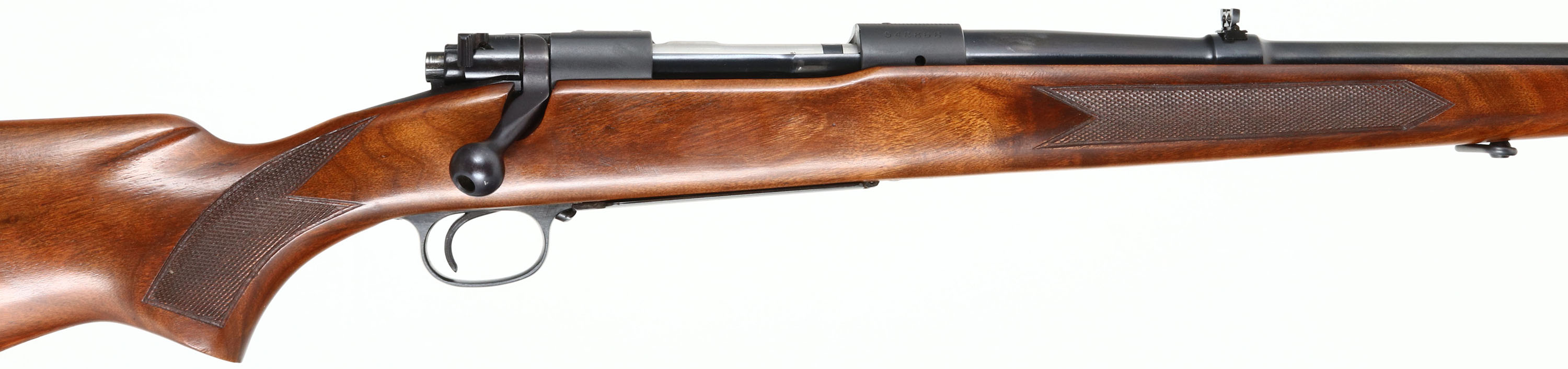 Winchester, Model 70, CAL: 338 WIN MAGNUM, MFG: 1962, SN: 548866, Bolt Action Rifle, 25'' barrel. Desired pre-64. The original, checkered & flat pistol grip Monte Carlo stock is excellent. There are very few light handling marks to the original finish. The original metal blue finish rates 99% overall. Bore is excellent. The receiver has factory provision holes available for scope mounting, while the barrel holds a folding rear & a hooded front ramp sights.. Stock carries a Winchester ventilated recoil pad. Factory sling swivels. Cosignor indicates this rifle has never been fired outside the factory test fire. An original & excellent condition pre-64 Model 70.* FFL or C&R Req. - Value: 1500 to 3000