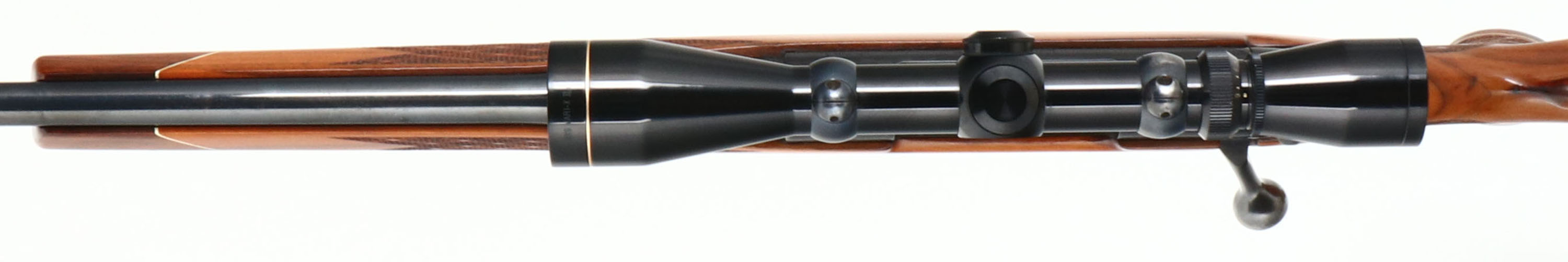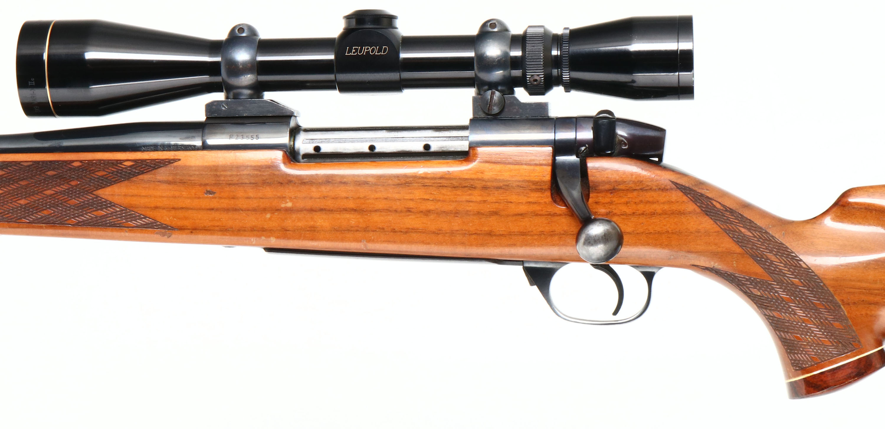 RARE Weatherby, Model MARK V Deluxe, LEFT HANDED, Marked 257 MAGNUM, MFG. 1967, SN: P23555, Bolt Action Rifle, 24'' Round fast tapered barrel. Early W. German, first series production. The .257 Weatherby Magnum was designed in 1944 & introduced commercially in 1945 by Roy Weatherby, as a wildcat cartridge for chambering in his rifles. Of the calibers Weatherby invented, the .257 WM caliber was known to be his personal favorite. The original cartridges were formed using Winchester's .300 H&H Magnum. It travels 3,870 fps (80 grain bullet), giving you the flattest trajectory of any 25 caliber rifle in the world. Its also capable of firing a 115 gr (7.5 g) Nosler Ballistic Tip bullet at 3,400 ft/s (1,036 m/s) generating 2,952 ftlbs of energy, which is comparable to factory loads of the .30-06 Springfield & the .35 Whelen in terms of energy, meaning it packs a high speed wallop at long distances. The factory Monte Carlo cheeked walnut stock is excellent & original, with early factory skip-line checkering & rosewood/white diamond pistol grip cap & tipped forend. The factory finish is excellent, with minor finish level scuffs, scrapes & scratches, mostly around the trigger guard. The original high luster metal blue finish is 97% on barrel, receiver & floorplate. Bore is excellent, shiny & bright. Mounted with a Leupold Gold Ring 3x9 VERI-X Iic scope & no open sight provisions. Stock carries a White-Line recoil pad. Factory sling studs. The .257 Weatherby makes an ideal pronghorn, medium game species or varmint cartridge. Bluebook states premiums are paid for this caliber, particularly when LEFT HANDED. An overall excellent, high original condition, & vintage Weatherby in a rare collectable caliber.* FFL or C&R Req. - Value: 1400 to 2000