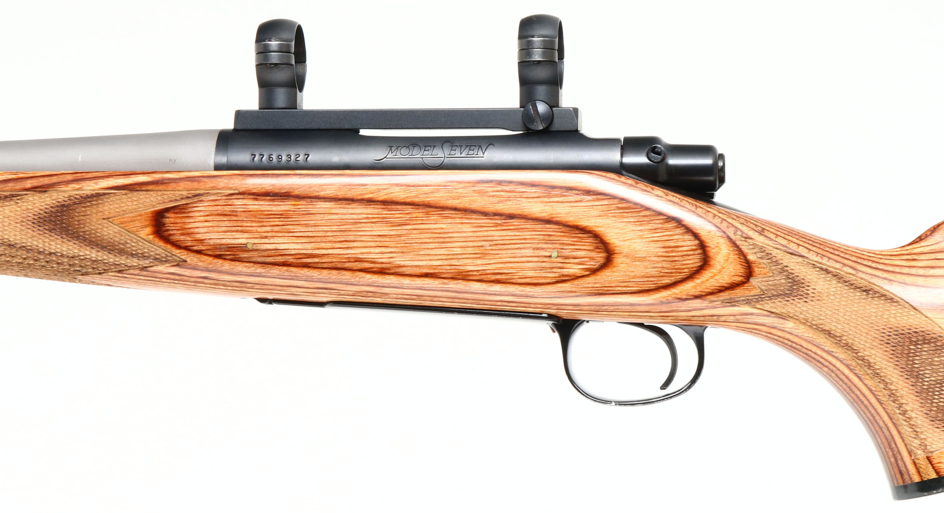 Remington, Model SEVEN, CAL: 300 REM SA ULTRA MAG, MFG: 2003, SN: 7769327, Bolt Action Rifle, 24'' barrel. The original checkered & capped pistol grip laminated wood stock is excellent. The are only a couple of tiny scuffs & dings to the original finish. The original metal blue finish on the receiver rates 98%, while the stainless barrel is excellent with a few minor scuff or scrapes. Bore is excellent. The receiver holds a Leupold scope base & scope rings, while the barrel carries no sight provisions. Stock carries a Remington solid red recoil pad. Sling studs. Excellent overall condition. Comes with a full box of Nosler Ammo. FFL Req. - Value: 500 to 1000