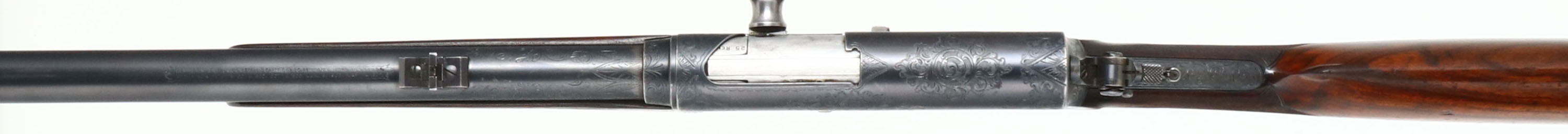 FANTASTIC ENGRAVED Remington, Model 8 No. 5 Expert Grade or later known as an ''E'' Grade, Custom Shop Rifle, marked .25 Rem., MFG. 1909, SN: 13359, Semi-Auto Rifle, 22'' barrel, This rifle, invented by John Browning, was America's first successful semi auto high-power rifle. 5 shot fixed magazine. These take down rifles were often broken down into the 22'' & 20'' halves & placed into leather cases for train rides to countryside hunts & shoots. The special order rifle has high grade English walnut wood stock & forearm, which are excellent, with nice figure to the grain. Factory checkering is 22 lines-per-inch. The stocks carry the original factory finish, with added oils & show minor handling scuffs, scratches & dings. The inlaid silver initial plate in the belly of the stock is inscribed with art deco initials ''RES''. The original metal blue finish rates 90%, with blue thinning at the carry points of the receiver & barrel. The large receiver side panels are covered with what Remington marketed as ''rich scroll hand engraving & game scenes''. The left side of receiver is engraved with a large standing buck in a grassy meadow. Engraving also found on base of magazine, safety, trigger guard, tangs & barrel jacket. Bore is excellent & bright, with high lands & grooves. Rifle fitted with a Lyman tang sight, folding leaf rear sight & silver bead front blade sight. Tight action & functions as it should. A very rare & highly collectible example of Remington's custom shop talents.* FFL or C&R Req. - Value: 7500 to 12500