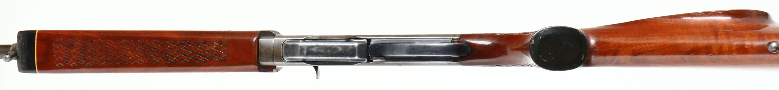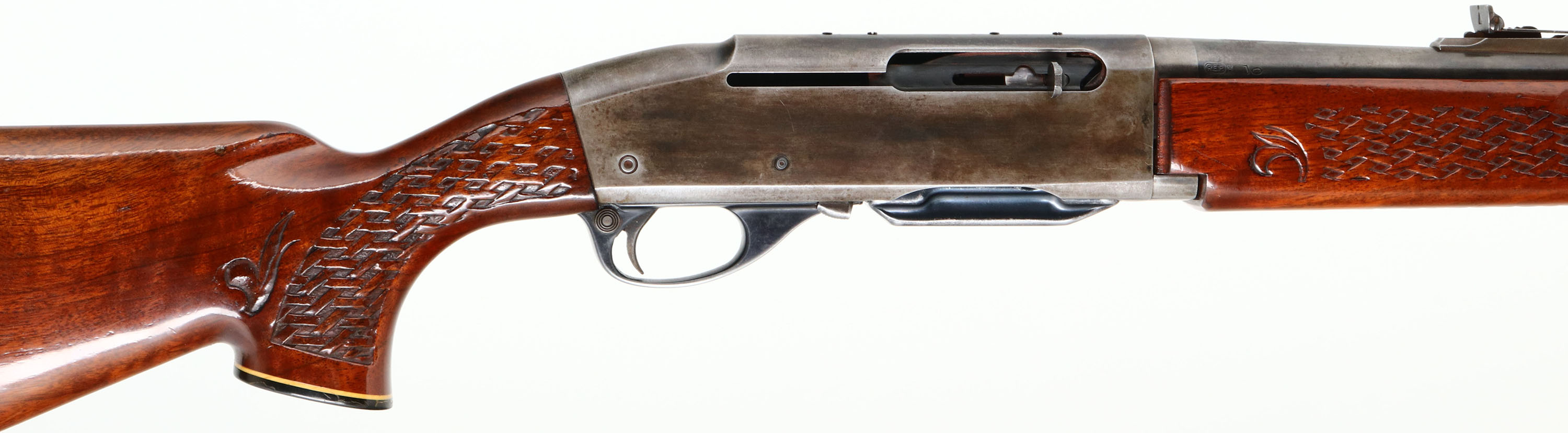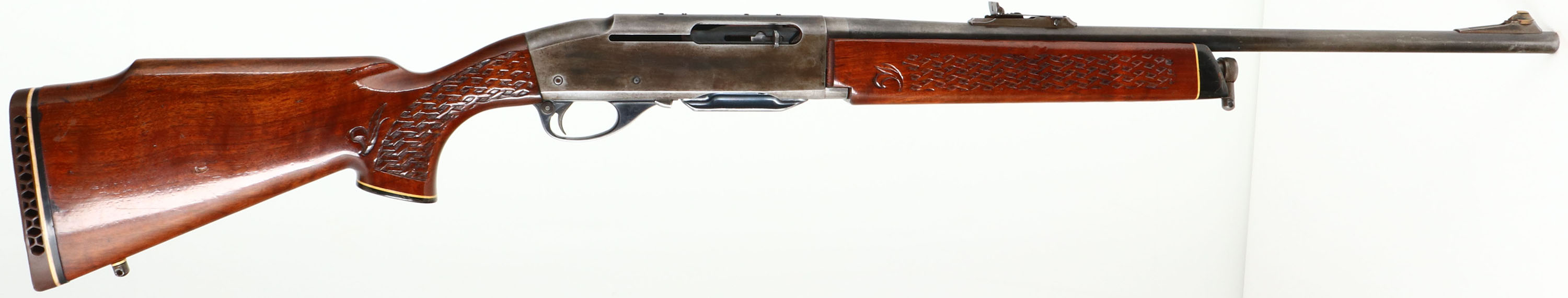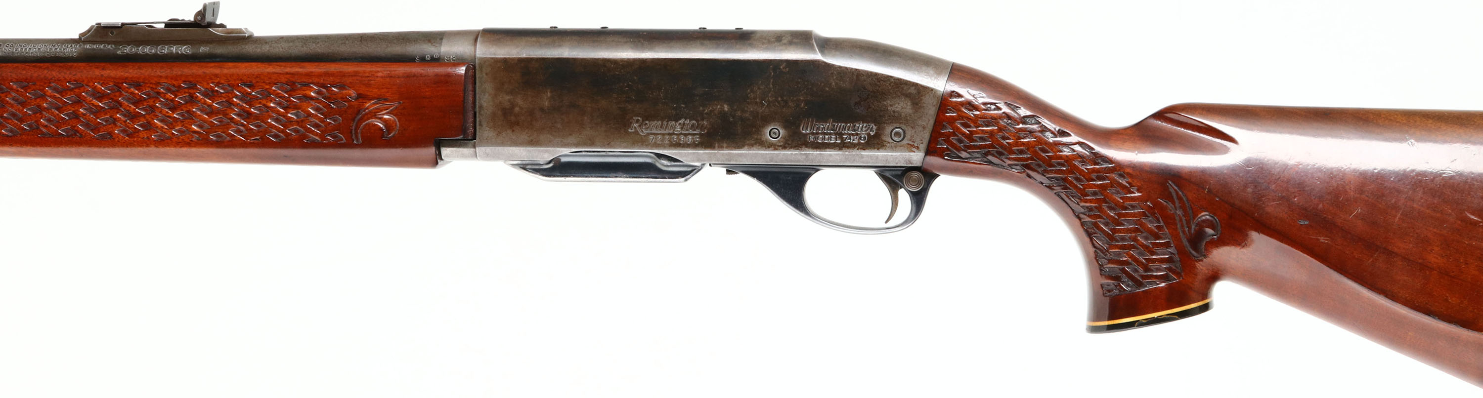 Remington, Model 742 Woodsmaster, 30-06 SPRG. Cal., MFG. 1972, SN: 7226365, Semi-Auto Rifle, 22'' round barrel, The factory basket weave checkered & capped pistol grip wood stocks are very good, solid & original. They carry several minor scuffs, handling marks & contusions to the factory finish. The factory metal blue finish has worn off to mostly a gun metal gray, with a thin layer of brown patina & some remains of original blue. Ramp adjusting rear sight & ramped brass blade front sight. Receiver has been factory tapped for potential scope mounting, a scope was previously mounted. Bore is excellent. Stock carries a White Line ventilated kickpad. 13 1/4'' LOP over pad. Sling swivel provisions. A popular caliber semi-auto hunting rifle. FFL or C&R Req. - Value: 250 to 450