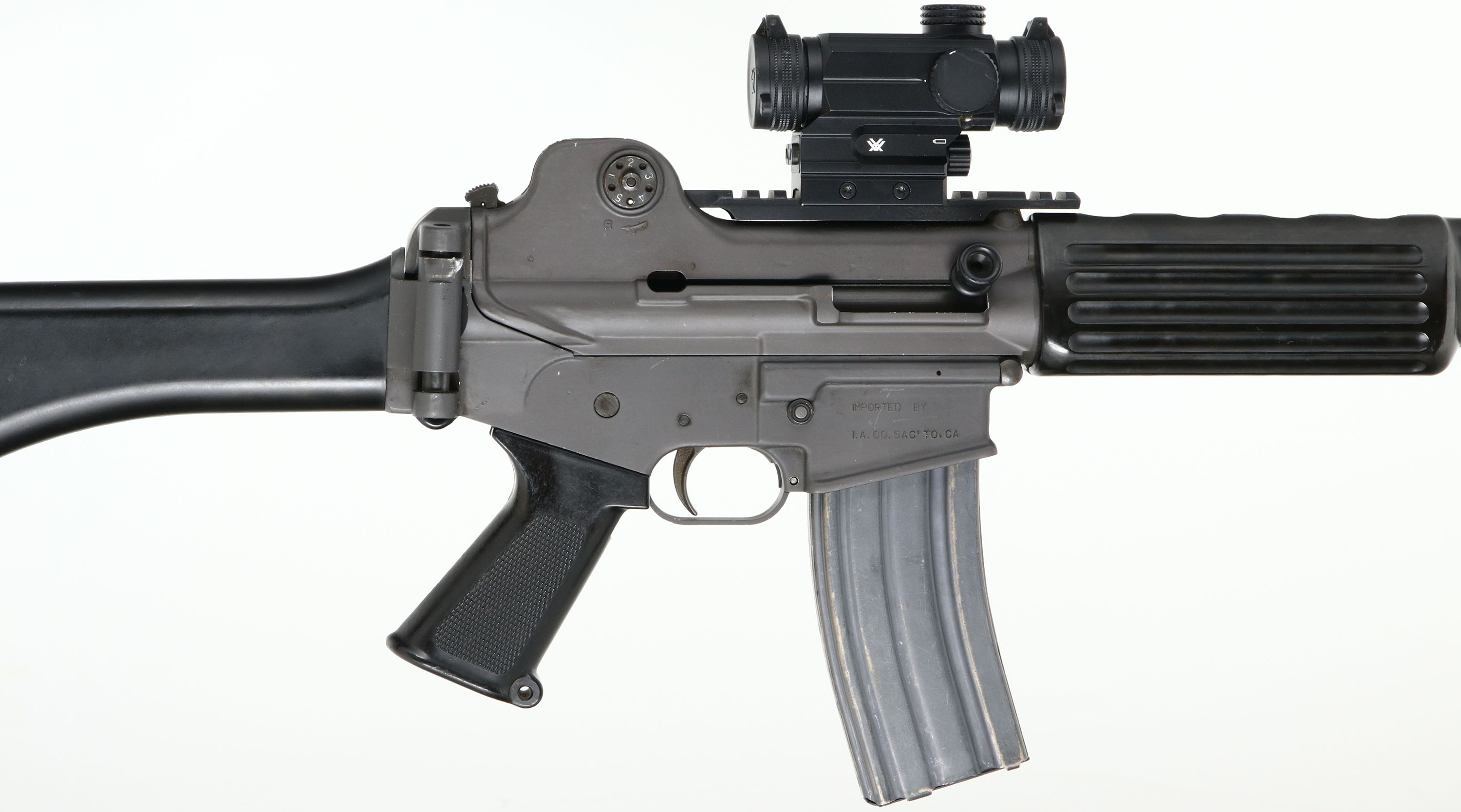Daewoo Precision Industries, AR-100, CAL: 5.56, MFG: Modern, SN: 485966, Semi Auto Rifle, 18'' barrel. The synthetic collapsible folding stock, grip & grooved forend are very good & solid. There are handling marks & overall light wear from honest use. The parkerized finish on the receiver is very good, with scrapes & blemishes throughout. The military style finish on the barrel is very good, with some spotting near the forend. Bore is very good, slightly rough. The rifle is fitted with its original iron sights & there is an added upper picatinny rail that holds a Vortex Spitfire AR Red-Dot sight. Sling loops present. Comes with a 30rd mag. FFL Req. - Value: 1000 to 2000