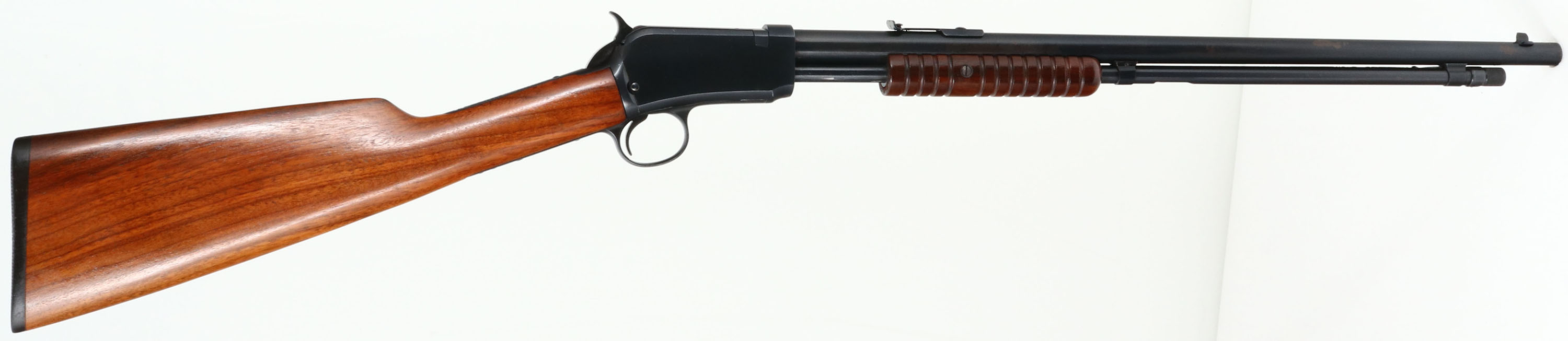 FANTASTIC Winchester, Model 06 , .22 S. L. LR., MFG: 1923, SN: 656731, Pump Action Rifle, 20'' Round barrel, The original straight grip walnut stocks are excellent, with wonderful straight grain. The forearm is of the corn cob style of the model 1890. The original finish is excellent, with virtually no rubs or handling marks. The original metal blue finish on the barrel is 95%, with a handful of spot of flakey finish loss toning to a brown patina. The receiver & mag tube display 98% of the original blue. Bore is excellent. Fitted with standard barrel sights. Winchester plastic buttplate, with engraved screws. A truly excellent, original & collectible condition example.* FFL or C&R Req. - Value: 2500 to 4000