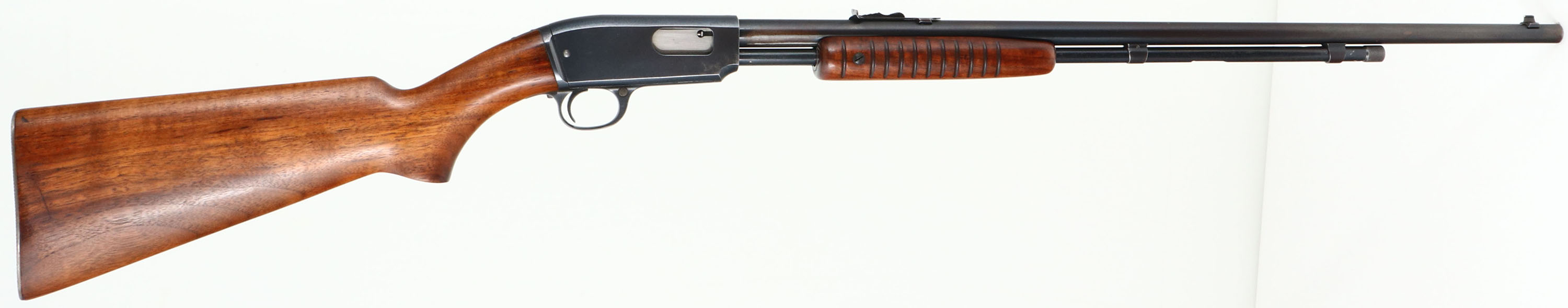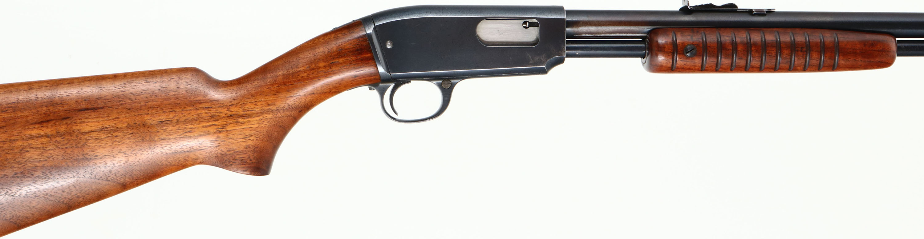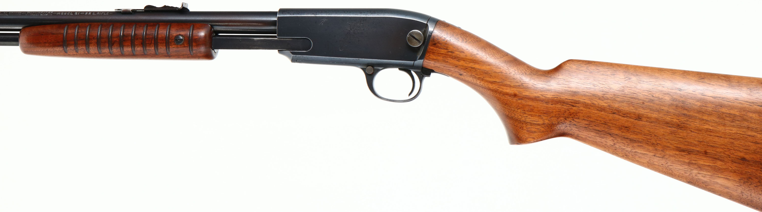Winchester, Model 61, CAL: .22 L. RIFLE, MFG: 1938, SN: 37589, Pump Action Rifle, 24'' round barrel. Rare single caliber marked 61 with the early pre-war small forend & pre-war rust blue finish. The original flat pistol grip wood stock & grooved forend are excellent, having been lightly sanded & very nicely refinished. There are very few minor contusions, scrapes & scratches. The original metal finish rates 70% on barrel toning a bit gray & toned to a thin brown patina in areas of loss. The finish on receiver & mag rates 80%, with some speckled haze developing on the receiver. Bore is excellent. The barrel holds an adjustable rear sight & small blade front sight. Buttstock carries the earlier checkered metal buttplate. FFL or C&R Req. - Value: 600 to 1200