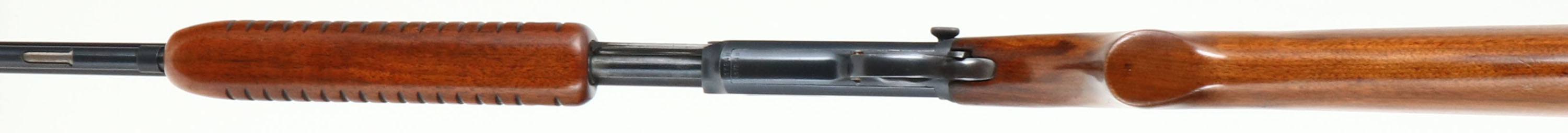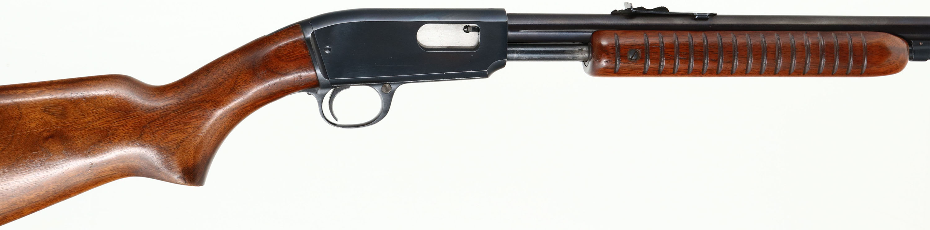 Winchester, Model 61, CAL: .22 S. L. or L.R., MFG: 1949, SN: 137248, Pump Action Rifle, 24'' Round barrel. The original flat pistol grip wood stock & grooved forend are excellent, with several minor contusions & scratches to the original finish. The original metal blue finish rates 95% overall. Bore is excellent. The barrel holds the original adjustable rear & small blade front sights. Buttstock carries the earlier checkered metal buttplate. Smooth action. Excellent & original example. FFL or C&R Req. - Value: 600 to 1200