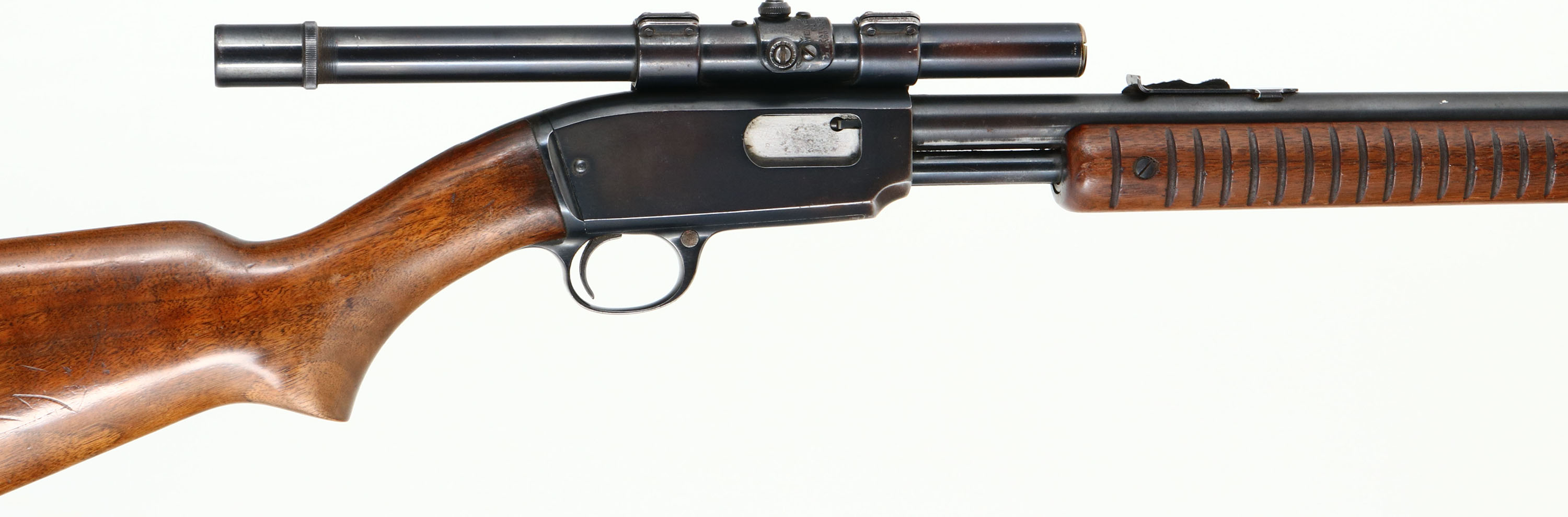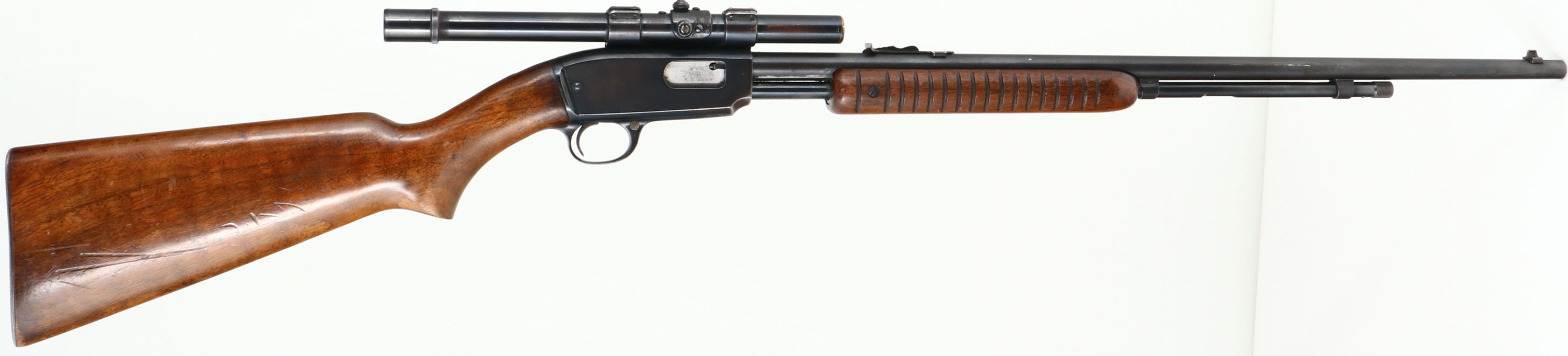 Winchester, Model 61, CAL: .22 S. L. or L.R., MFG: 1951, SN: 176052, Pump Action Rifle, 24'' Round barrel. The original flat pistol grip wood stock & grooved forend are very good, displaying numerous small, contusions, scrapes & scratches to the original finish, which is wearing thin at the wrist & forend. The original metal blue finish rates 80% overall. Bore is excellent. The receiver is fitted with a side mounted Weaver G4 scope, while the barrel holds an adjustable rear & small blade front sights. Buttstock carries the earlier checkered metal buttplate. Smooth action. Likely a good shooter FFL or C&R Req. - Value: 300 to 600