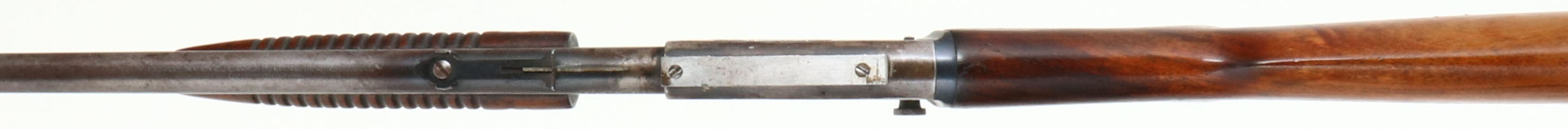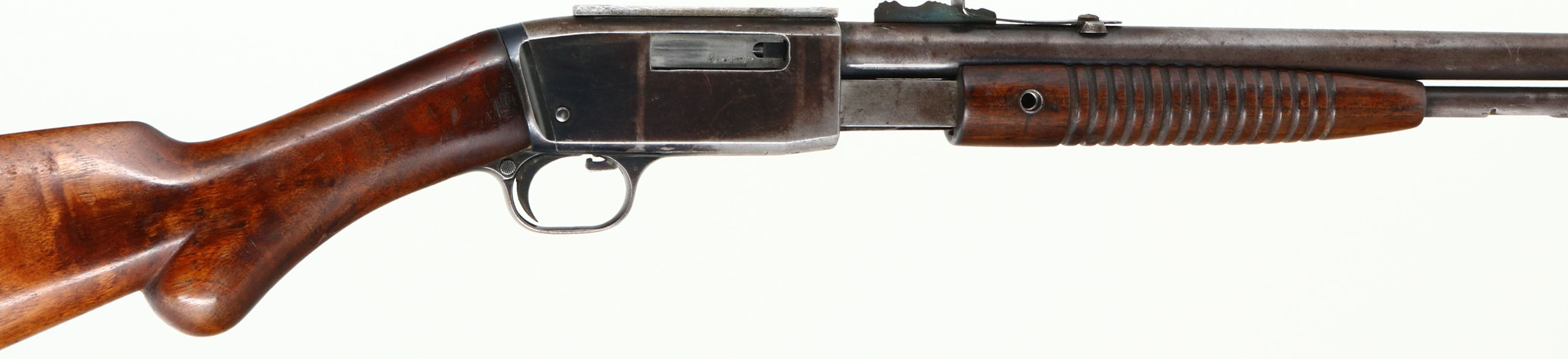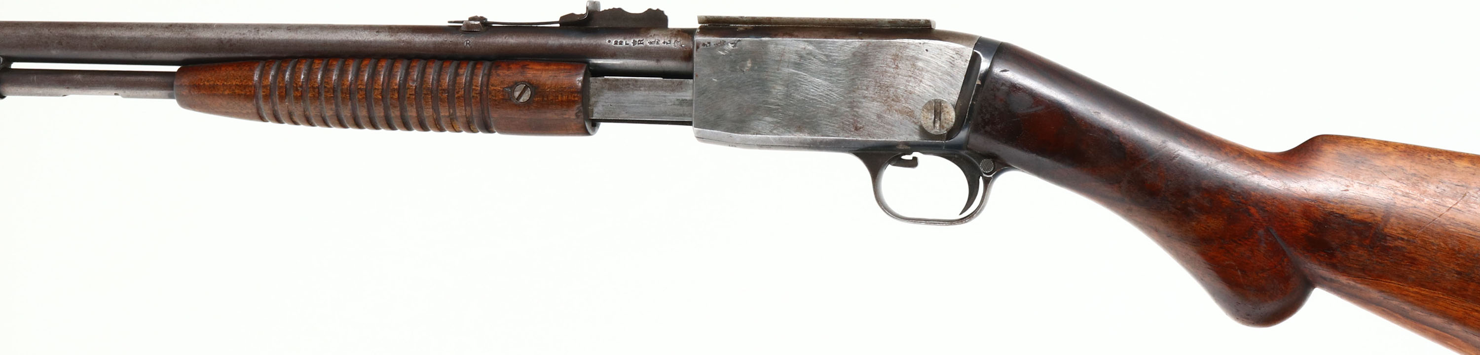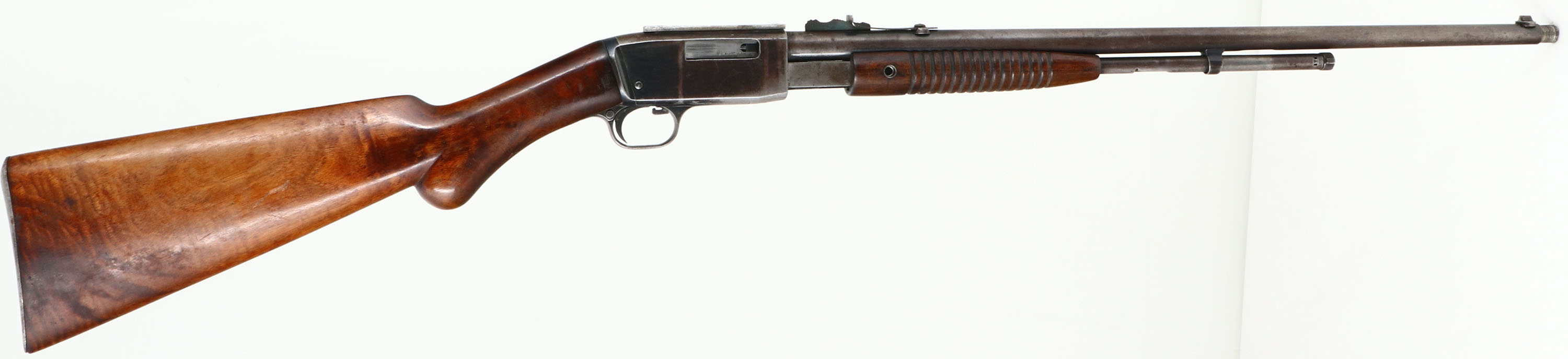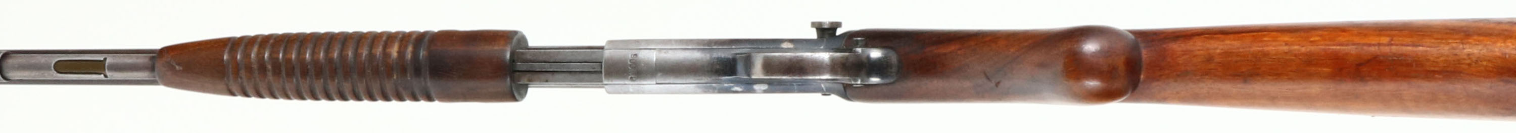 Fabrique Nationale D'Armes, (FN Browning), Model ''Trombone'', CAL: 22 L, MFG: 1956-57, SN: 86906, Pump Action Rifle, 22'' round barrel. The original round pistol grip wood stocks are very good, with minor contusions & scratches, & one 2'' scrape on the right side of stock. The original finish has worn thin in areas & darkened in others. The original metal blue finish remains at 30% on the receiver, with the rest of the metal worn gun metal gray & having a thin brown patina. Bore is very good. Smooth metal buttplate. The barrel & receiver carry European proof stamps. The receiver carries a scope block, while the barrel carries a replaced adjustable rear & small blade front sights. The barrel was likely fitted with a suppressor in the past & remains threaded at the muzzle of the barrel. One of the forend screws is missing. Overall, still a good shootable example. FFL or C&R Req - Value: 250 to 450