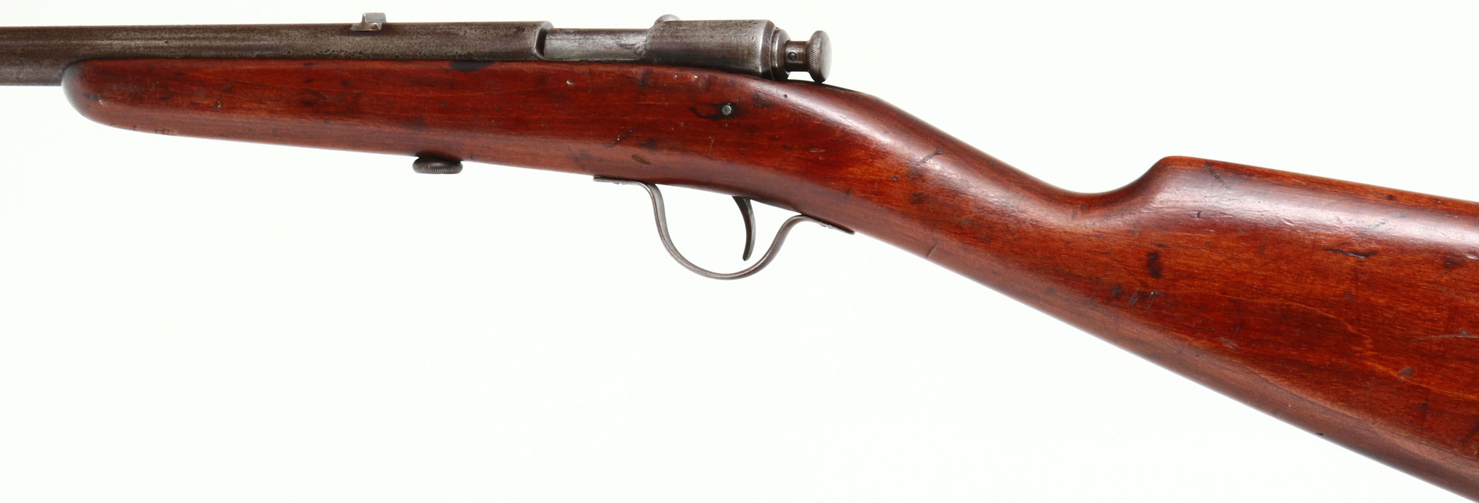 VERY RARE Winchester, Model 1900, .22 Short & Long Cal., MFG. 1900-02, SN: None, Bolt Action Rifle, 18'' round barrel, RARE CHECKERED & ''WINCHESTER'' STAMPED BUTT. The original straight grip wood stock is excellent & solid, with minor scrapes, contusions & handling marks to the original finish. The original metal has worn mostly gun metal gray, with some spotting & toning to a brown patina. Bore is fair, with visible rifling amongst cleaned pitting & roughness. Original sights. Rare example with the checkering & ''WINCHESTER'' stamping clearly visible on the butt of the stock. Great little original & collectors' gun. Stamped butt adds 100% collectors' value. FFL or C&R Req. - Value: 800 to 1500