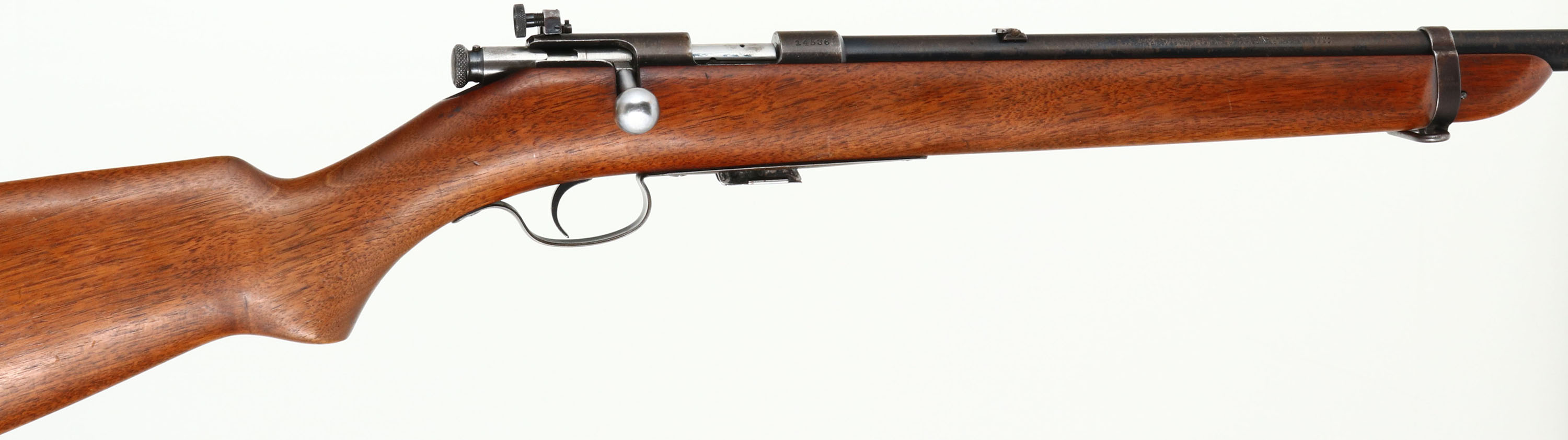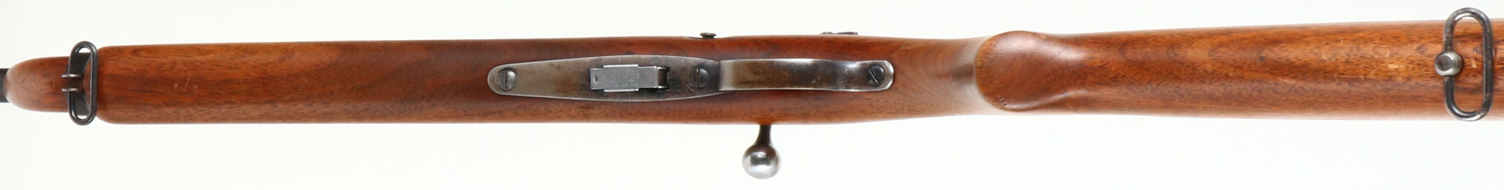 Winchester, Model 57 Target, .22 LONG R. Cal., MFG: 1932, SN: 14536, Bolt Action Rifle, Mag fed, 22'' barrel, with barrel band. The original flat pistol grip wood stock is excellent & solid, with minor handling marks & scuffs to the original finish. The original metal blue finish remains at 50% on the barrel, 20% on the receiver, with finish on the barrel band & trigger guard worn & toning to a brown patina. Bore is excellent. Military style target rifle, with correct Lyman peep sight, sling swivels, & ''Winchester'' stamped mag. Barrel fitted with standard front & folding leaf rear sights. Stock carries a checkered steel buttplate. A nice original condition & collectible rifle. FFL or C&R Req. - Value: 400 to 800