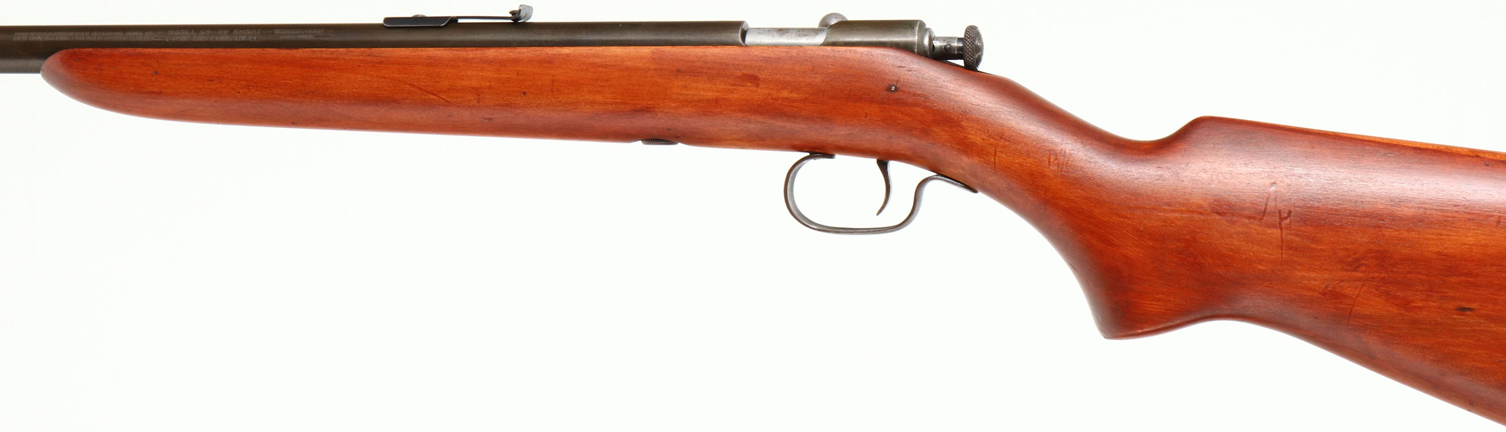 Winchester, Model 59, .22 S. L. LR. Cal., MFG. late 1930-31 SN: none, Bolt Action Rifle, 23'' barrel, Improved upon model 58. The original pistol grip wood stock is very good & solid, having been lightly sanded & refinished. There remains a few minor contusions & scratches. The metal finishes have toned to a thinning gray/brown patina. Bore is excellent. Barrel holds an adjustable rear sight & standard front sight. Winchester marked plastic buttplate. Fairly rare & nice over all condition. Limited two year production of approx. 9,200 mfg. FFL or C&R Req. - Value: 300 to 600