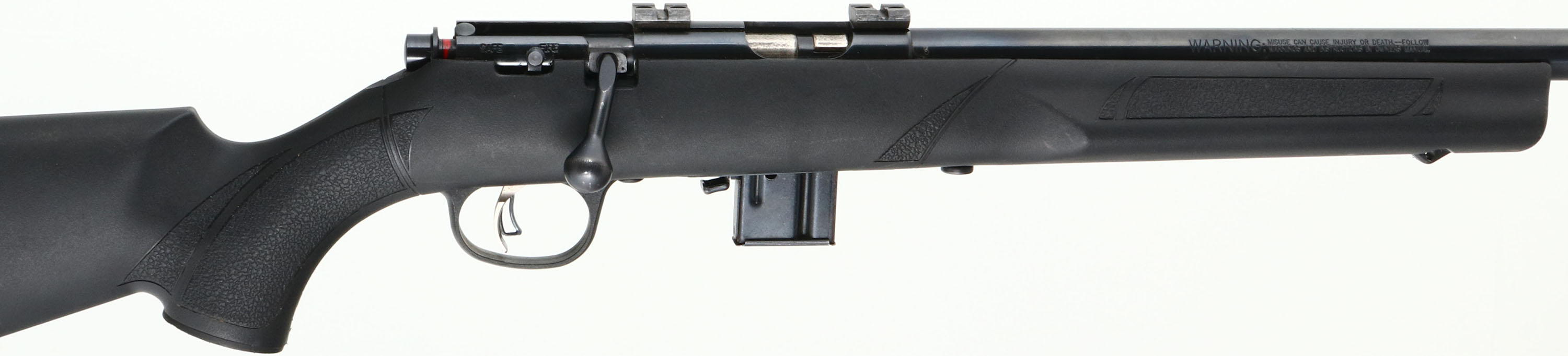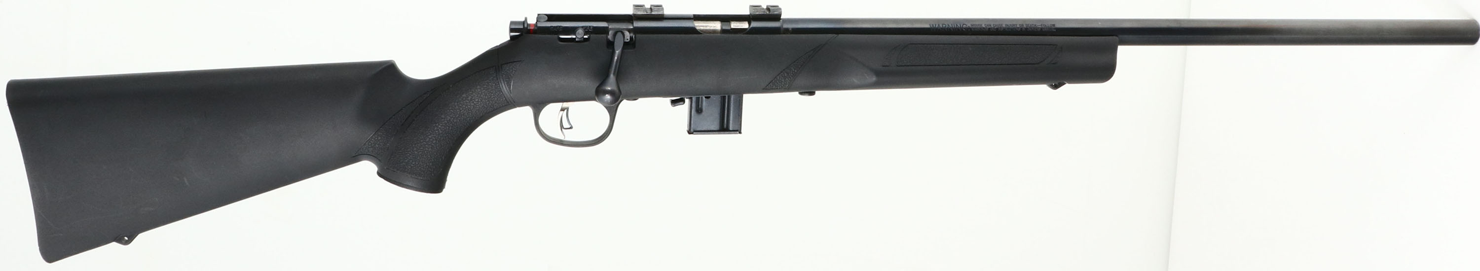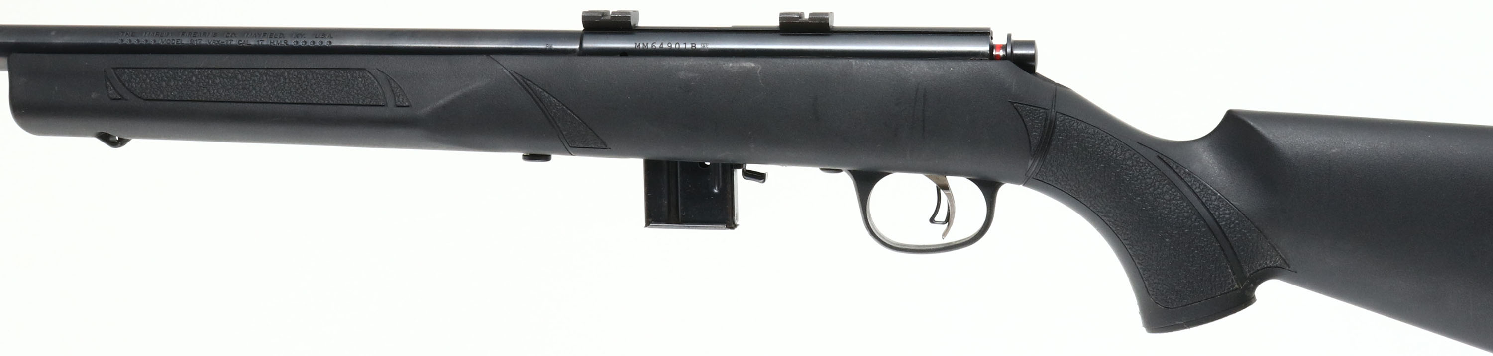 Marlin, Model 917, CAL: 17 HMR, MFG: Modern, SN: MM64901B, Bolt Action Rifle, 18'' barrel. The original flat pistol grip synthetic stock is excellent. The metal blue finish on the barrel rates 97%. Bore is excellent. The rifle is fitted with scope blocks, while the barrel has no open sight provisions. Sling provisions in stock. Detachable mag. FFL Req. - Value: 150 to 250
