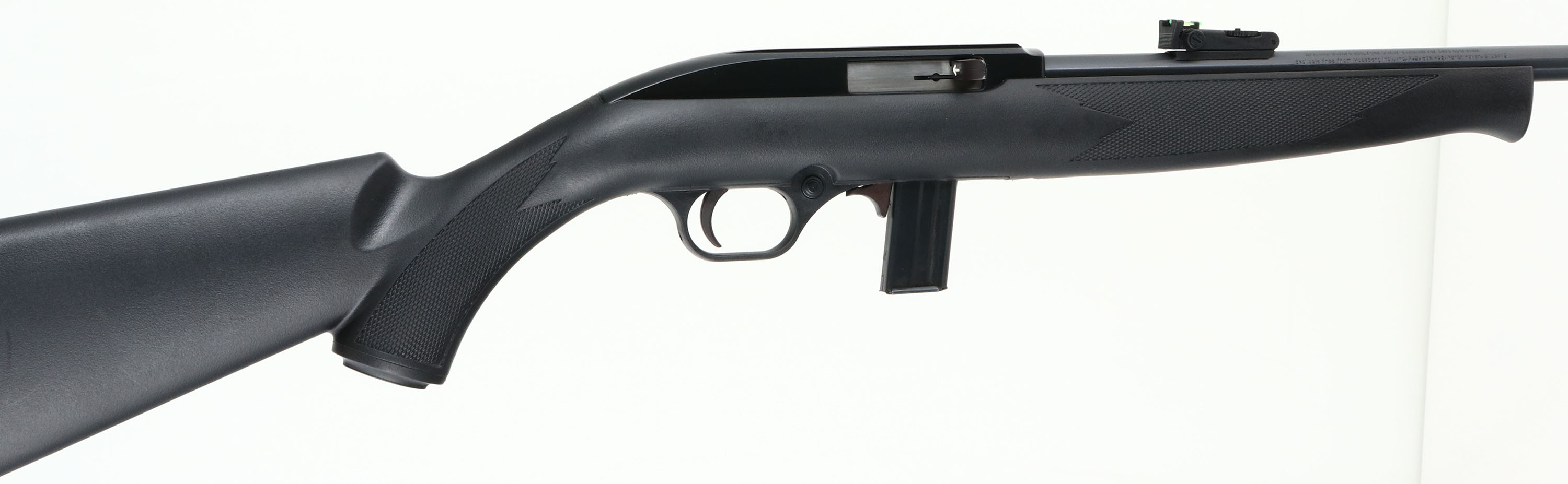 Mossberg, Model 702 Plinkster, CAL: 22LR, MFG: Modern, SN'' ERE4245708, Semi Auto Rifle, 18'' barrel. The checkered & capped pistol grip synthetic stock, with schnabel type forend is excellent. The metal blue finish on the barrel rates 99% & the matte black finish on the receiver is excellent. Bore is excellent. The barrel holds a turn dial adjustable two-rail green fiber optic rear sight & a hooded red rail fiber optic front sight. Stock carries a grooved plastic buttplate. Overall excellent. FFL Req. - Value: 100 to 200