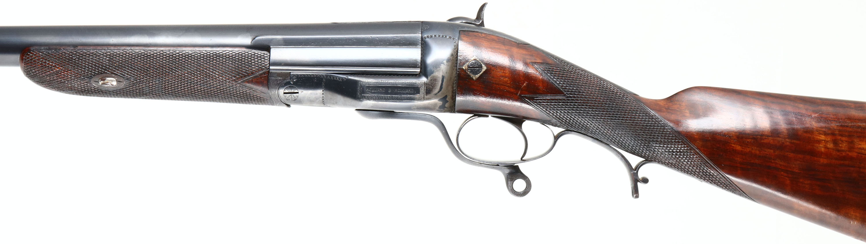 Holland & Holland, Wildfowling Shotgun, CAL: 4 Bore, MFG: 1800's, SN: 5779, Rotary Underlever Break Action Shotgun, 36'' barrel. The original checkered straight grip wood stock is excellent, having been lightly sanded & refinished. The checkering still protrudes nicely after the light restoration. The stock has a 1'' wood spacer added to the buttstock & small rectangular inlay at the toe. The metal blue finish has been restored, it rates 90% overall. There are a couple areas on the receiver worn to metal grey, with a thin brown patina. The sides of the receiver display simple ''X'' pattern border engraving while the top/upper tang have more intricate ornamental scroll, which can also be seen on the barrel end, around the roll stamp, lower tang, break lever, forend metal components & screws. The trigger guard is shaped in a unique fashion, with an integrated sling provision. The bottom of the barrel holds an original sling provision. Bore is excellent, with striations from use. The barrel holds a single front bead. Has a choked barrel, Stock has a solid orange rubber recoil pad. A rarely seen large bore bird gun by a very reputable gun maker. Antique, No FFL Req. - Value: 3000 to 6000
