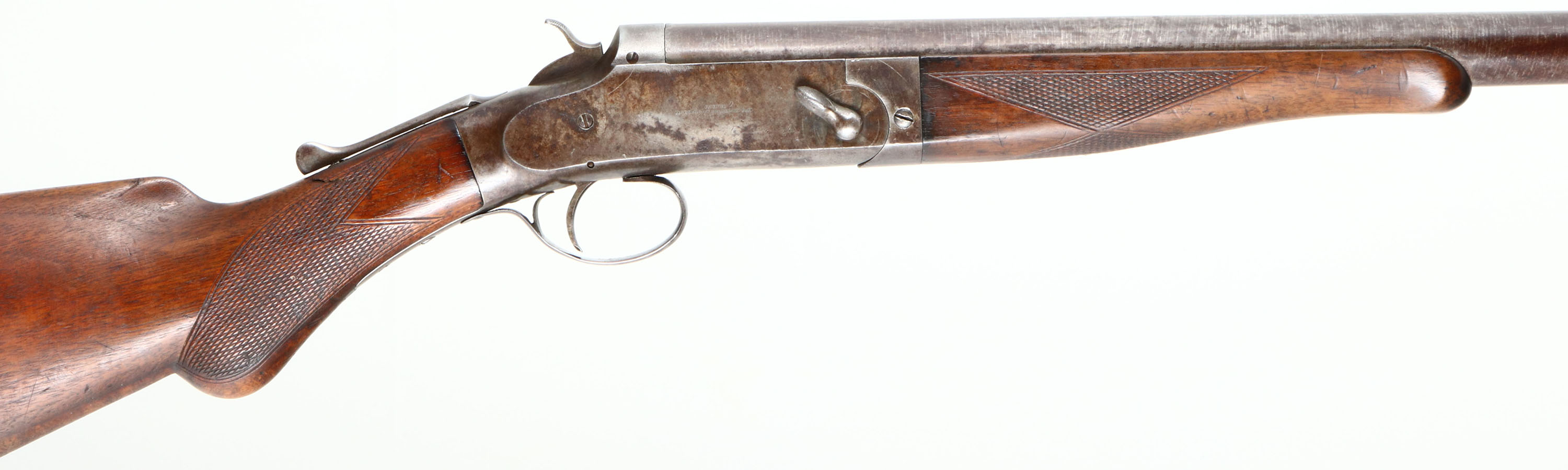 W.H Davenport, ''Goose Gun'', CAL: 10 Bore, MFG: 1896-1909, SN: 5073, Break Action Single Shot Shotgun, 36'' barrel. The checkered round knob grip wood stock & forend are excellent & solid, with protective oils added over time. There's a small crack on the right side of the wrist. The twisted steel barrel carries the original browned finish, with spots worn to metal grey. The receiver is case-hardened, with visible, but faint case colors. It is mostly worn to metal grey & toned to a brown patina, with intermittent rust spotting. Bore is excellent. The barrel holds a single front bead. No buttplate or recoil pad. FFL or C&R Req. - Value: 700 to 1200